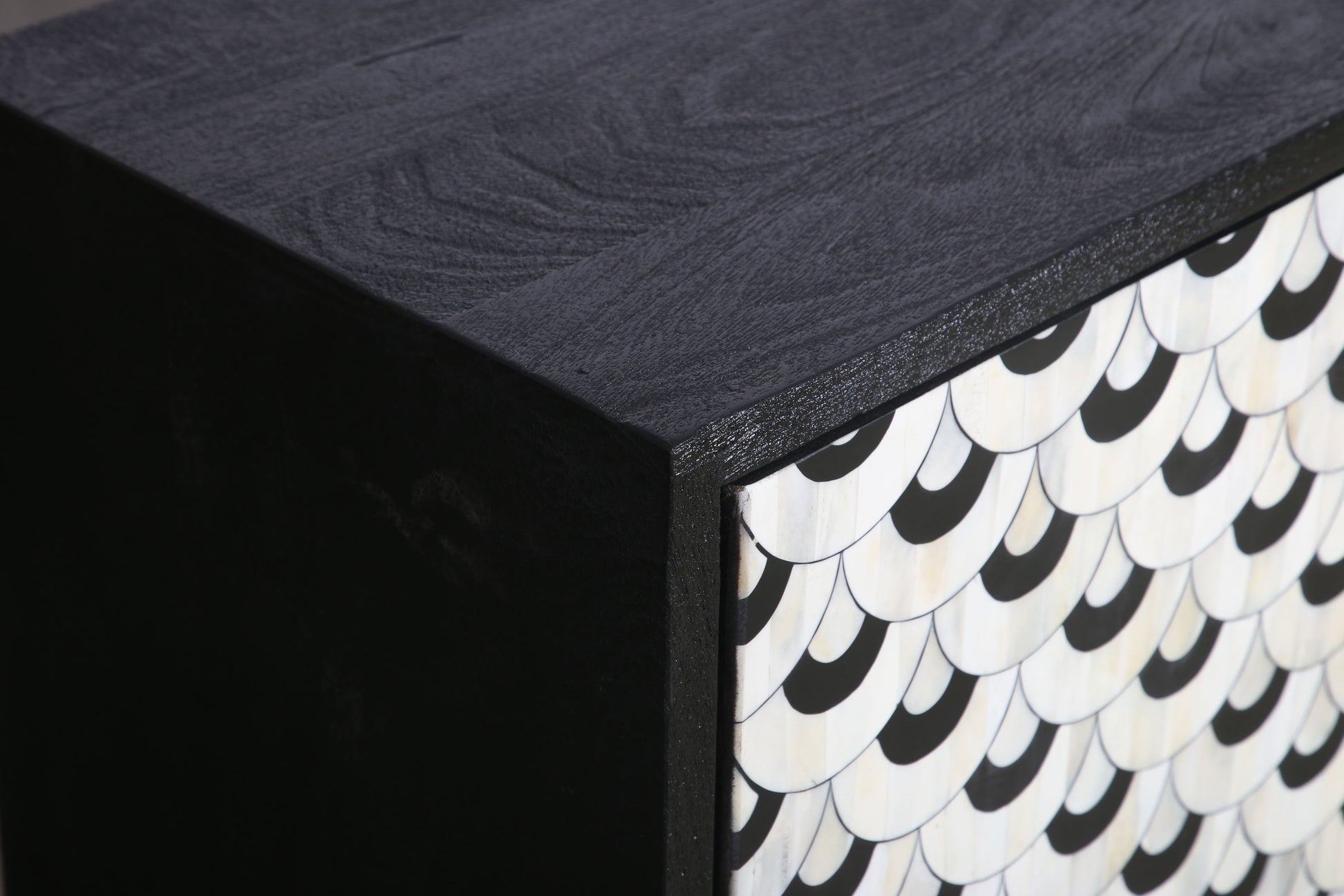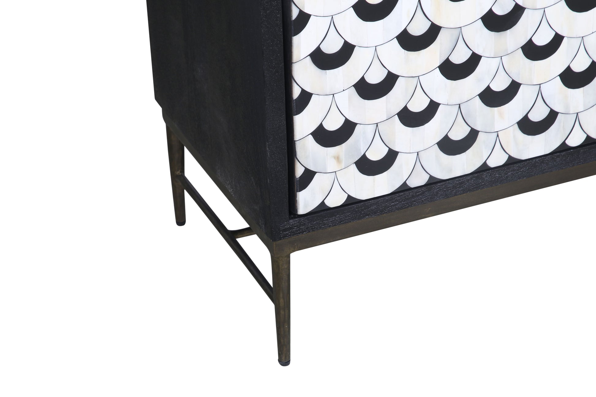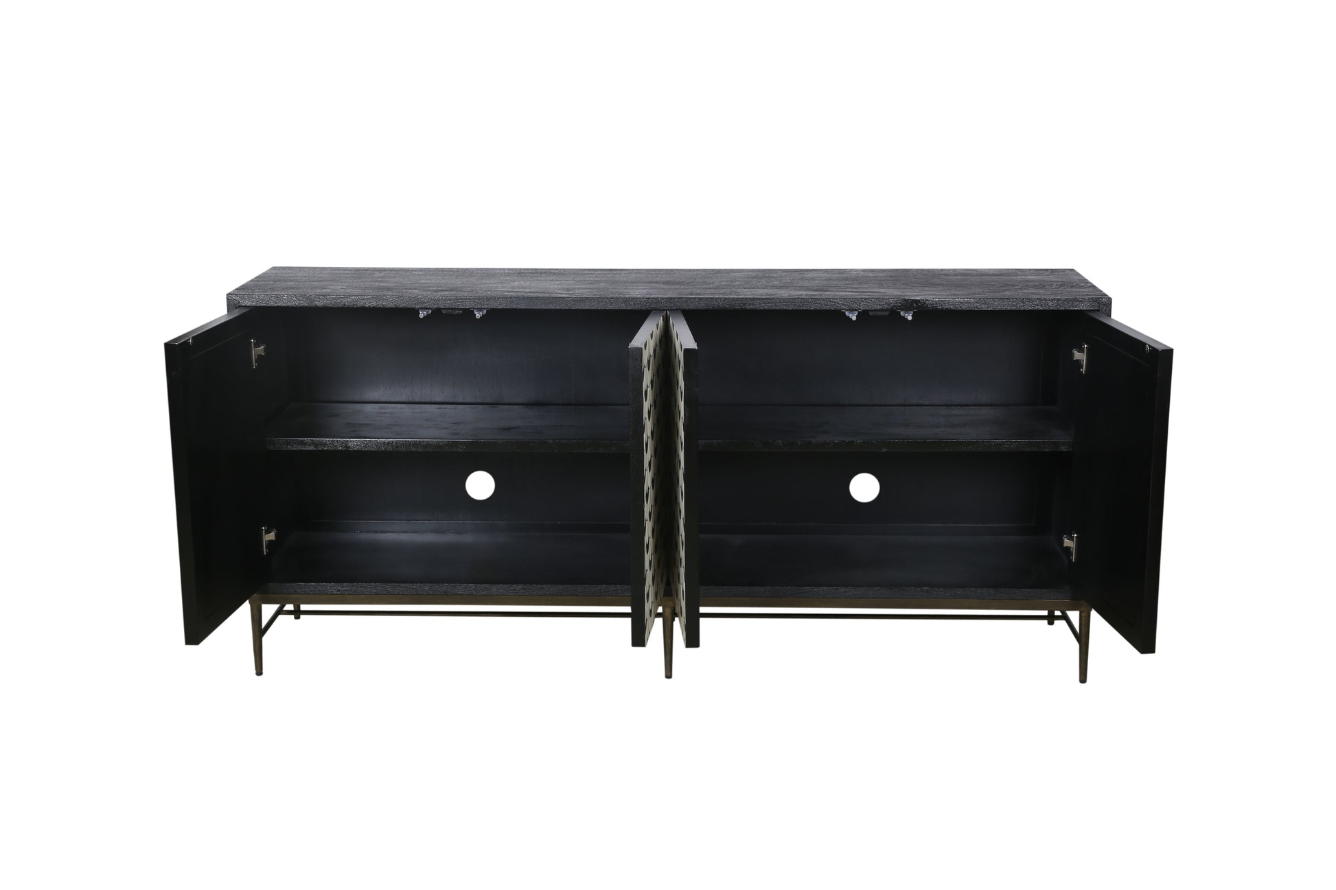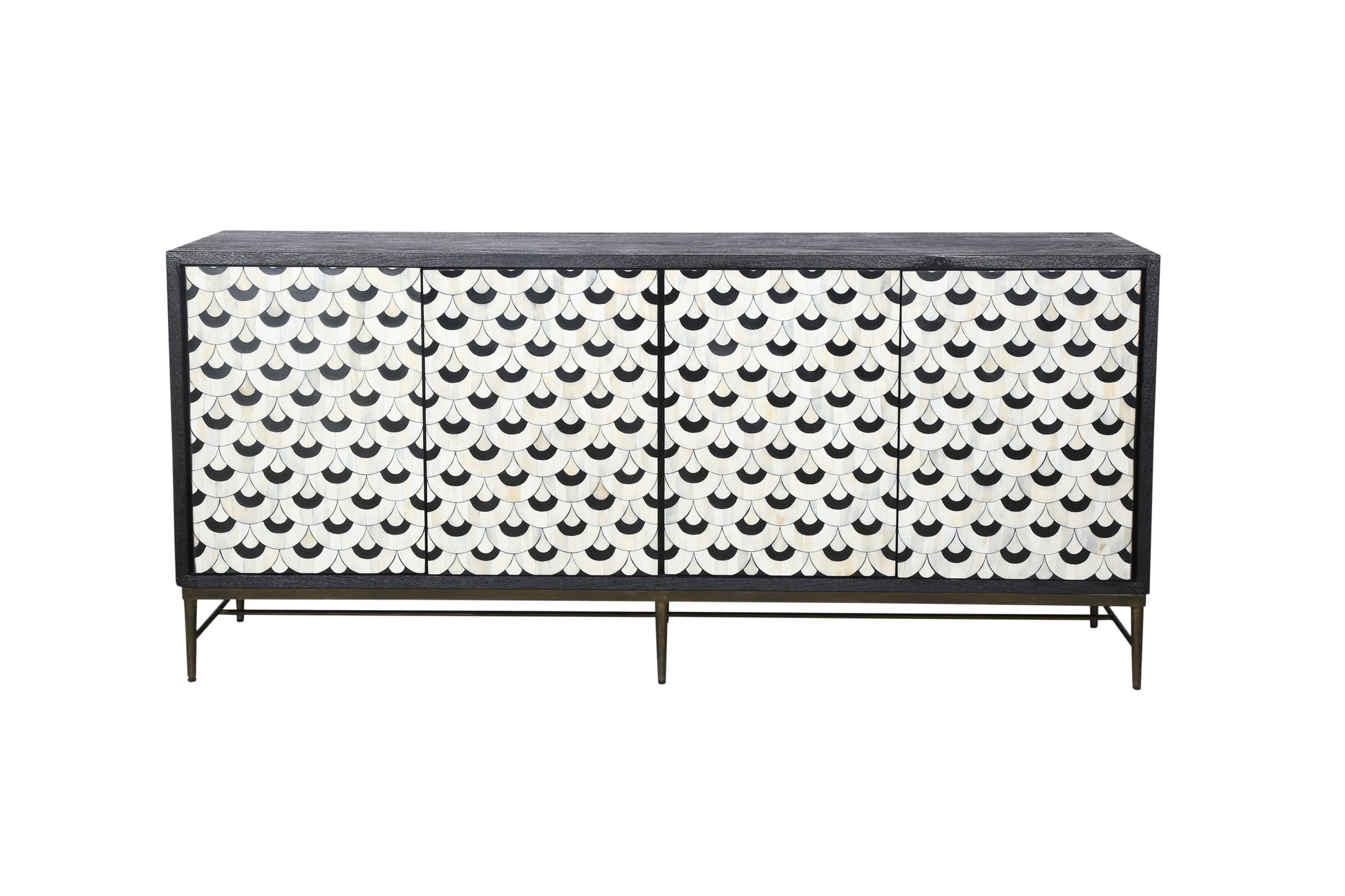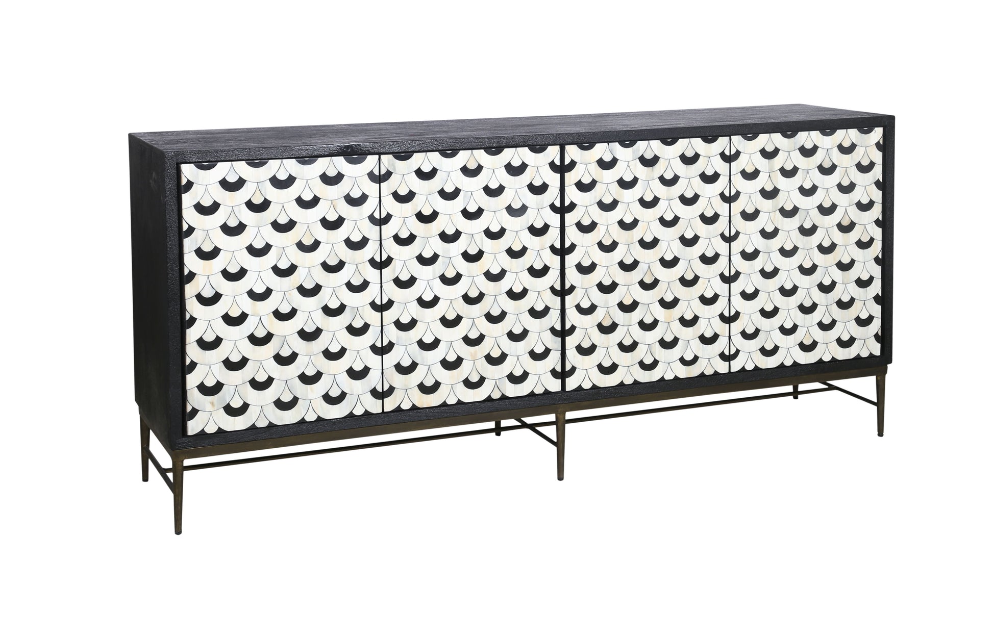 The Klaus Server offers a dramatic mix of materials and modern traditional design, making a bold statement in any room. The case frame is crafted from sandblasted solid mango in a matte ebony finish, providing a sophisticated, textured base. The doors are adorned with a scalloped pattern made of ivory and black bone and resin, creating a striking contrast that draws the eye. The iron base, with slim tapered legs and an antique gold finish, adds a touch of elegance and elevates the piece. Behind the four doors, fixed shelves and media cord management provide practical storage and organization, blending style with functionality in a beautifully crafted design.