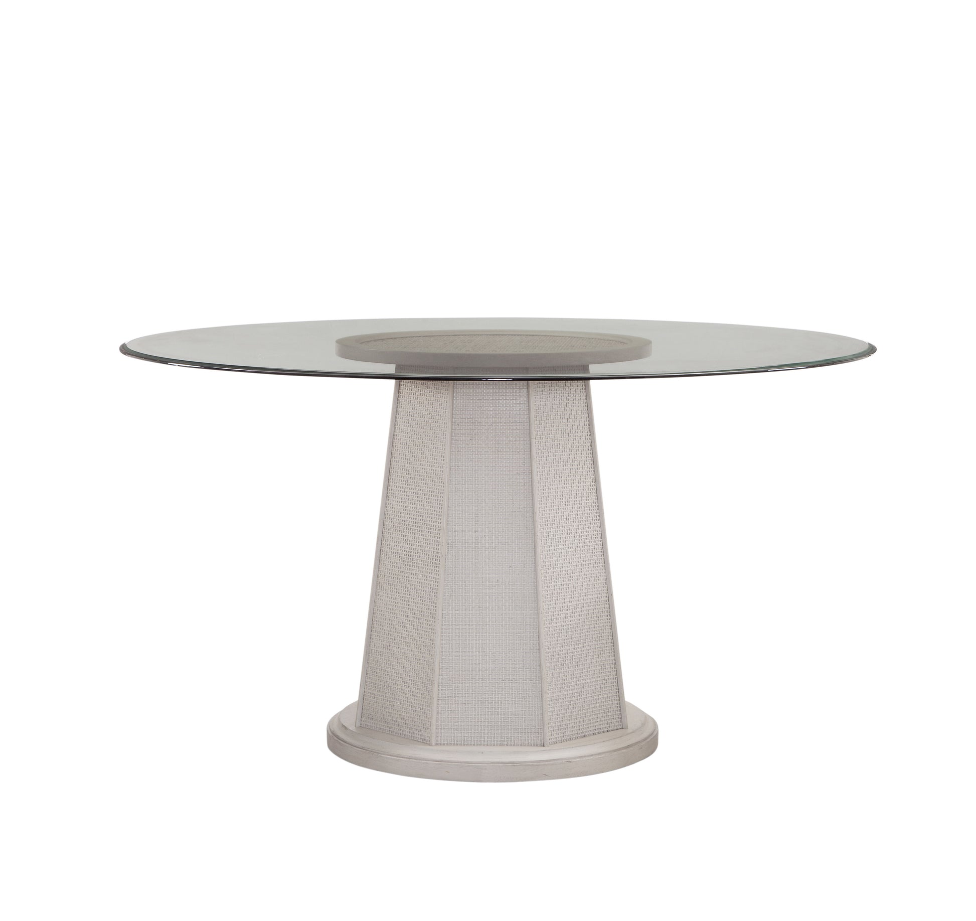 - Modern Boho and Coastal design merge elegantly in the Korey Round Dining Table, with a tapered pedestal base and intricate box-weave cane detailing, all finished in a serene white-wash on mindi veneers