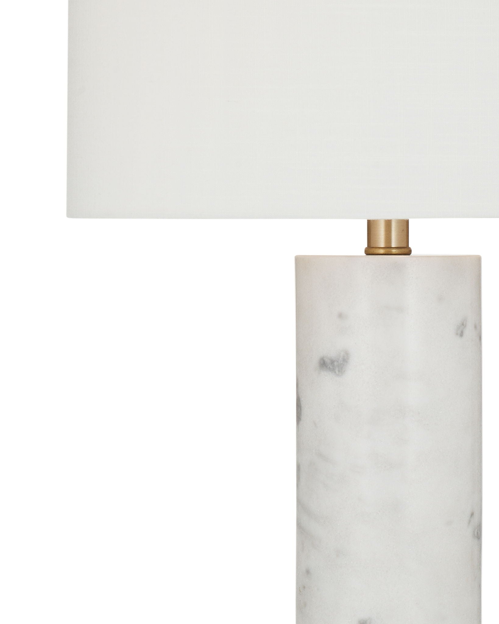 The Lenning Table Lamp showcases modern sophistication with its sleek white marble base and brushed gold accents. Paired with a classic white drum shade, this piece offers a refined, contemporary look that elevates any space.
