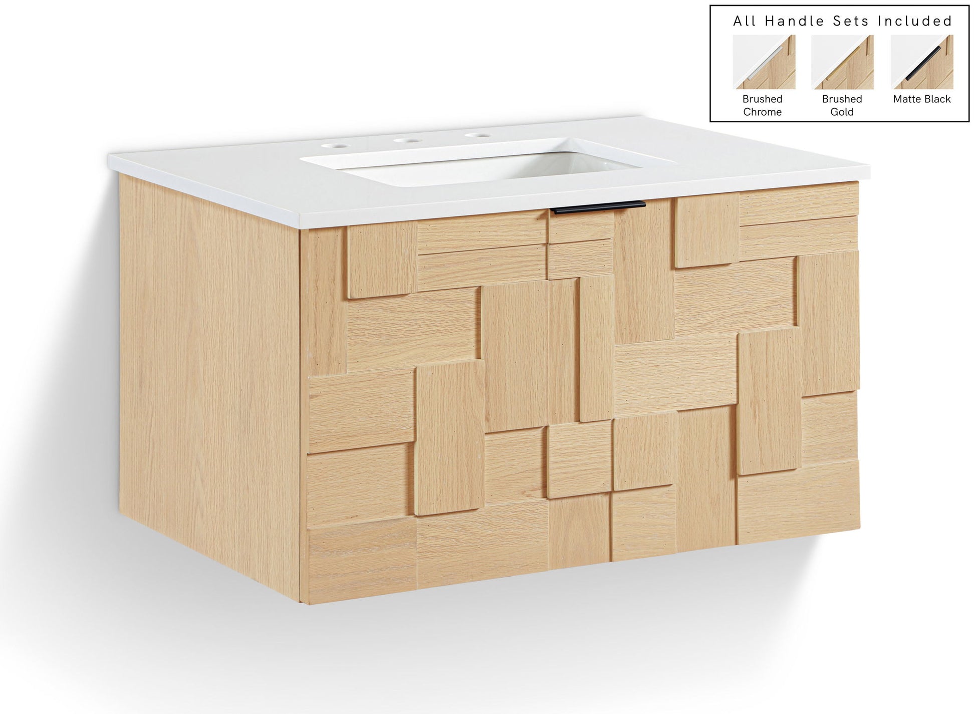 Rich wood and a striking geometric design make the Leonardo bathroom vanity a standout in any space. Topped with a sleek white engineered stone surface, it's a chic blend of function and modern style. Customize the look with your choice of brushed gold, chrome, or matte black handles, all included for a tailored finish.