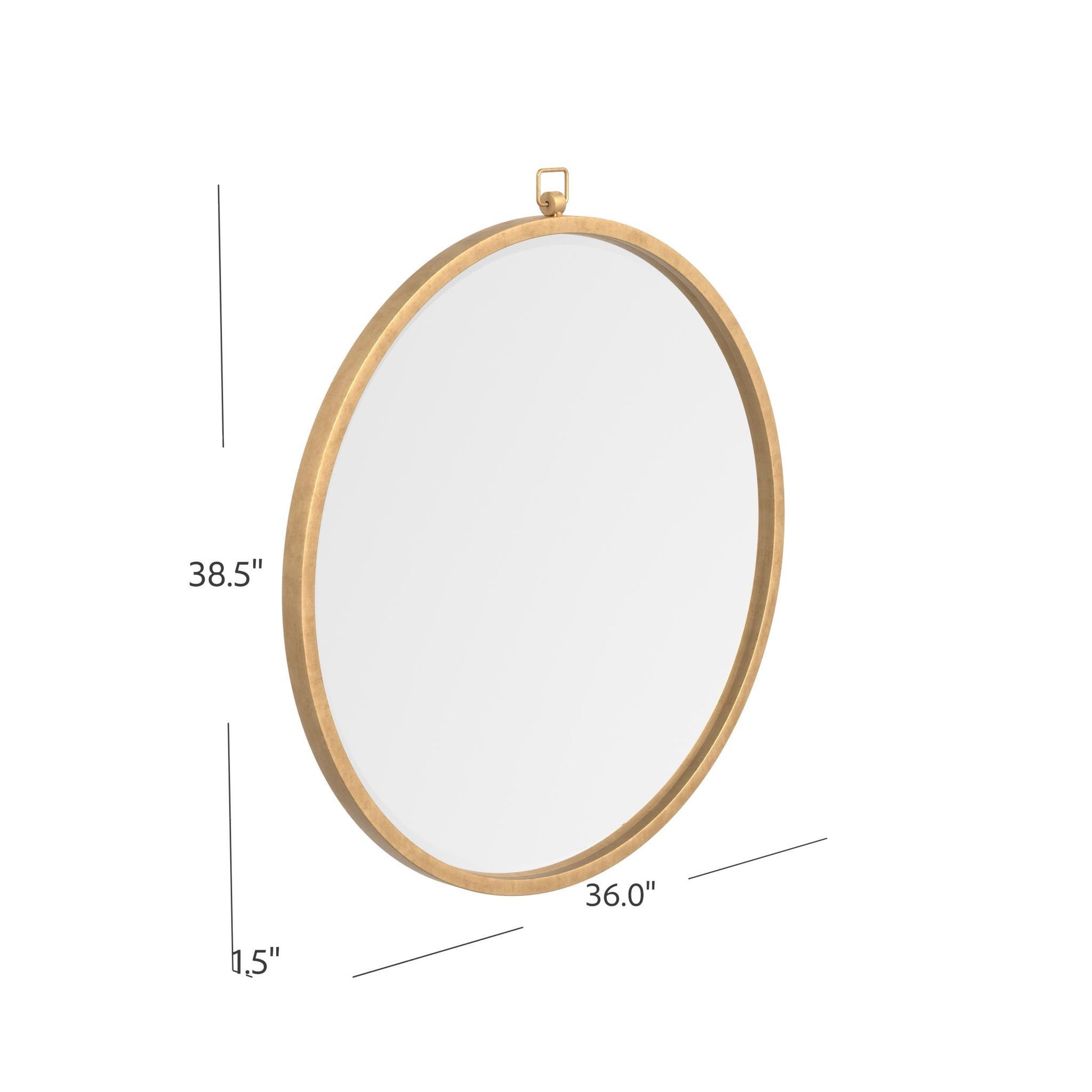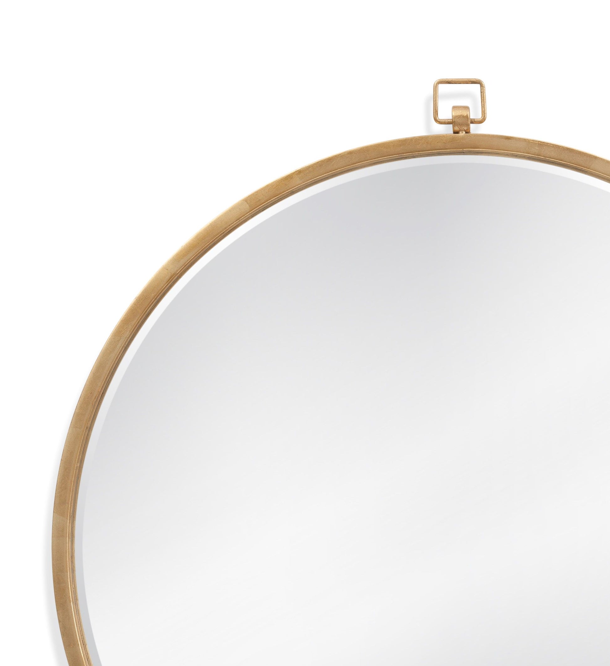 The Logaan Round Wall Mirror, adorned in gold leaf, features a sleek pocket watch bow detail, seamlessly blending modern and traditional styles. Its metal frame, finished in gold leaf with a square edge, adds a touch of sophistication to any space. With a beveled edge and square hanger, this mirror is both stylish and functional, enhancing the ambiance of your room effortlessly.