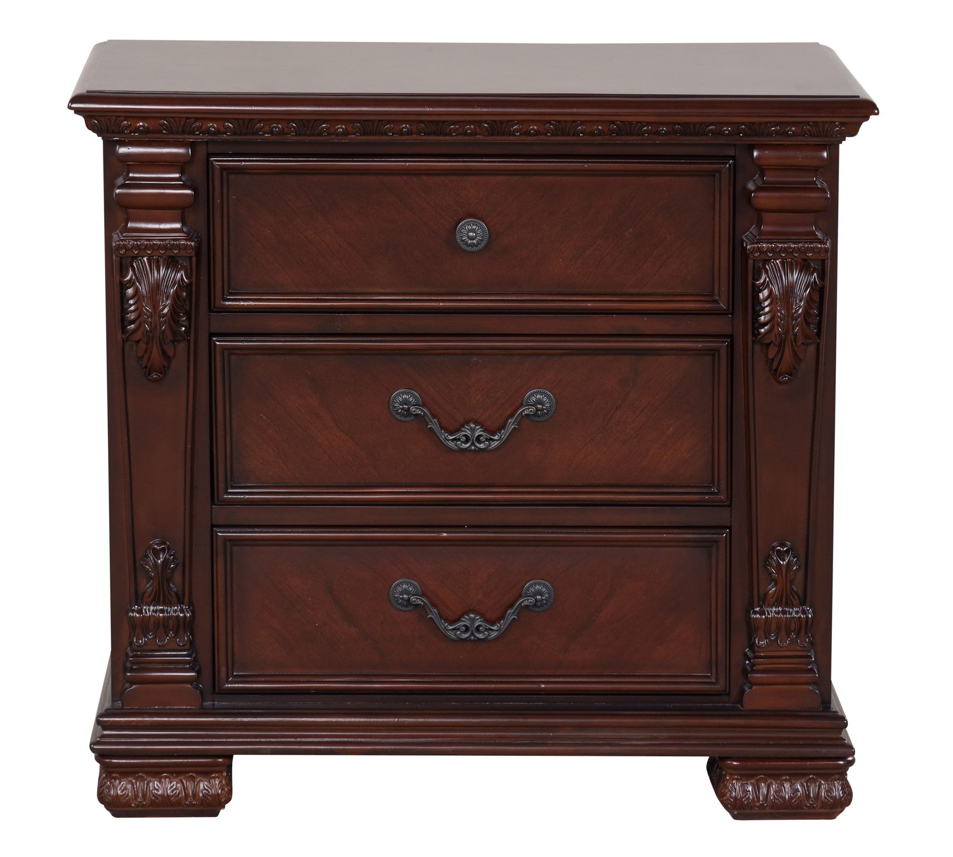 This charming nightstand is a wonderful addition to your bedroom, showcasing both practicality and a refined look. The warm cherry finish on the wood veneers enhances its aesthetic appeal, seamlessly bringing a touch of elegance to your space. With dimensions of 30"H X 33"W X 17"D, this piece is designed to fit nicely next to your bed or sofa without taking up excessive space. The nightstand features two spacious drawers, with the top drawer measuring 20x12x4.5 and being felt-lined to safeguard your jewelry or personal items. The bottom drawer, sized at 20x12x5, provides additional storage options, helping you to keep essentials organized and close at hand. Ease of use is a highlight of this design; the drawers glide open and shut effortlessly thanks to the easy slide ball bearing mechanism integrated into the structure. This nightstand is a blend of functional storage and classic aesthetics, making it an ideal choice for enhancing your bedroom's ambiance.