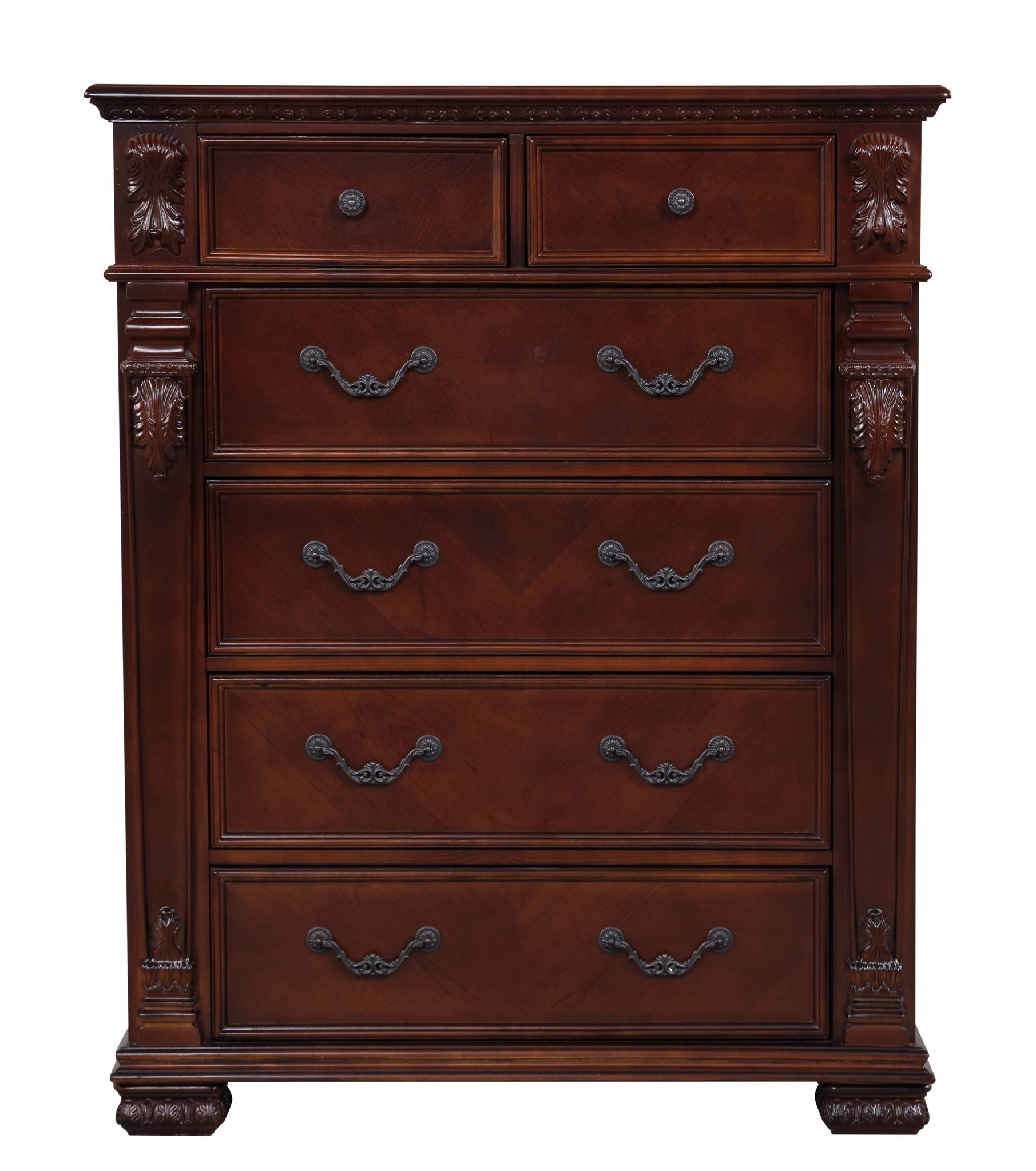 This impressive cherry drawer chest brings functionality and style to any room within your home. Its beautifully crafted cherry finish on wood veneers showcases a rich and inviting tone that complements diverse interior designs. Featuring dimensions of 54"H x 43"W x 19"D, this chest is designed to fit seamlessly into various spaces while providing generous storage options with six well-proportioned drawers. You'll appreciate how this chest efficiently keeps your belongings organized and readily accessible. The drawers are equipped with an easy slide ball bearing mechanism, allowing for effortless and smooth opening and closing. The construction incorporates sturdy materials that ensure durability and reliability throughout everyday use. Felt-lined top drawers offer the perfect cozy haven for your delicate items, enhancing both protection and presentation. Additionally, it complies with ASTM 2057 Anti Tip standards, prioritizing safety for families with children. With practical elements and an inviting look, this drawer chest is a valuable addition to your home.