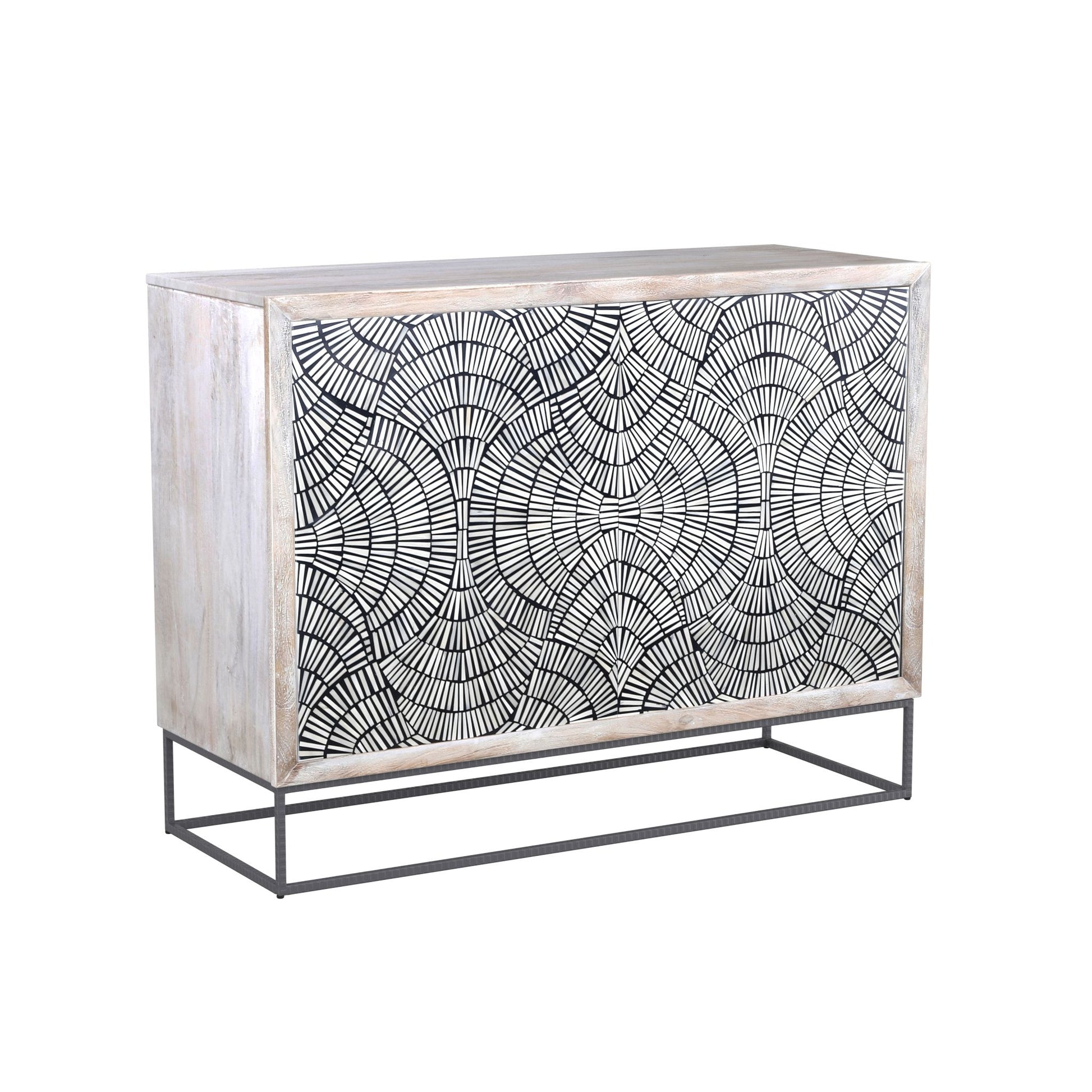 The Magnolia bar cabinet embodies a fusion of modern and bohemian styles, making it a standout piece in any space. Crafted from solid mango wood with a white-wash finish, its frame exudes a rustic yet refined charm. The touch-release doors reveal an intricately-patterned design crafted from contrasting bone and resin, adding an artistic flair. Supported by a textured solid iron base, the cabinet's interior features a crisp white finish and offers a variety of storage options for your bar essentials. As mango and bone are natural materials, each piece boasts unique variations in color, texture, and finishing, ensuring that your cabinet is one-of-a-kind. Elevate your home bar with this stylish and functional statement piece, perfect for those who appreciate modern design and natural materials.