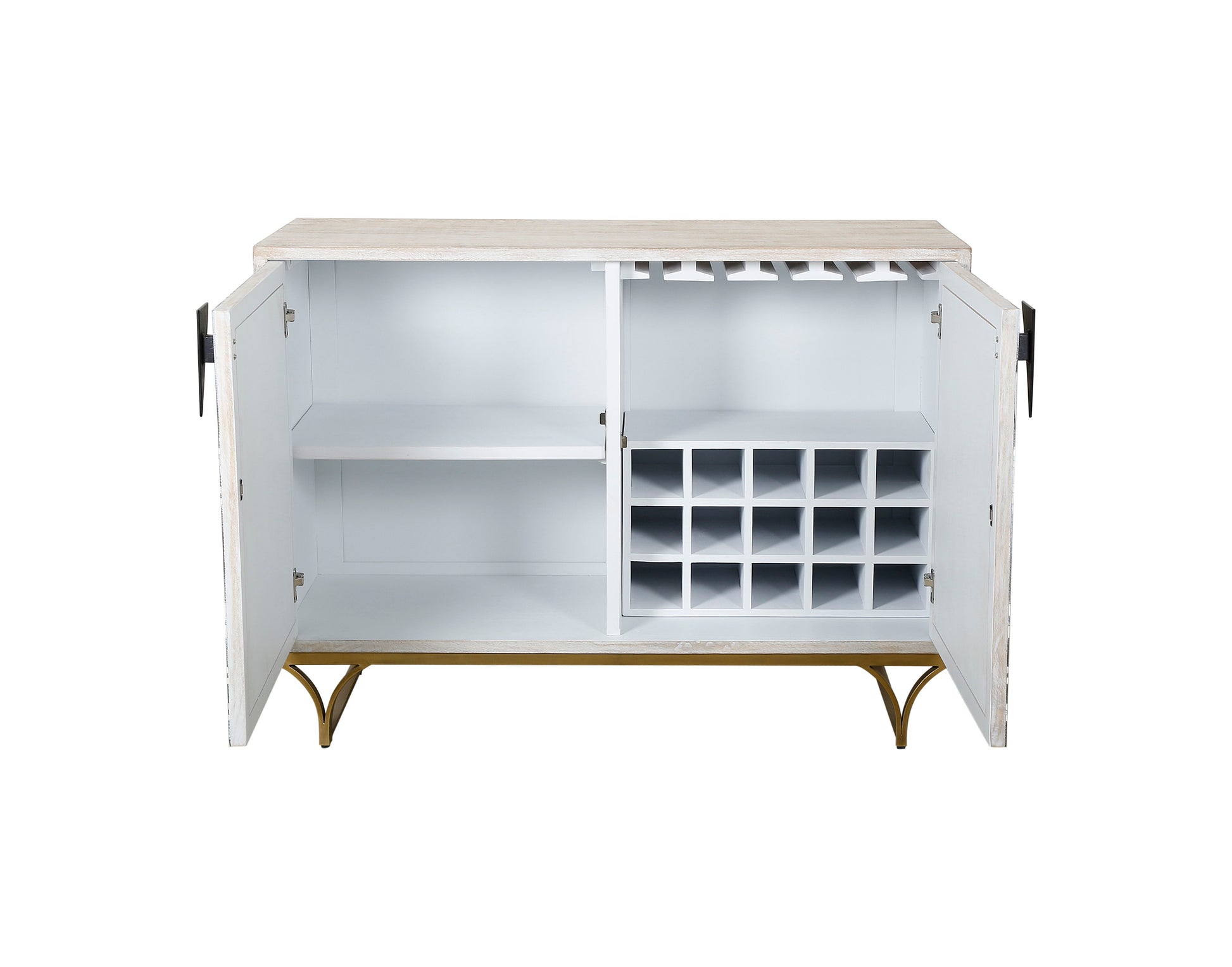 The Martina Bar Cabinet is a delightful fusion of modern design and functional elegance. Its exterior boasts a tasteful whitewash finish with captivating geometric patterns on the cabinet doors, created using bone and resin inlays. The antique bronze gold metal base adds a touch of sophistication to the piece. Inside, you'll find fixed shelving and convenient storage for wine bottles and glassware. The combination of these elements, from the whitewashed finish to the exquisite inlays and practical storage, makes the Martina Bar Cabinet a charming addition to your living space.