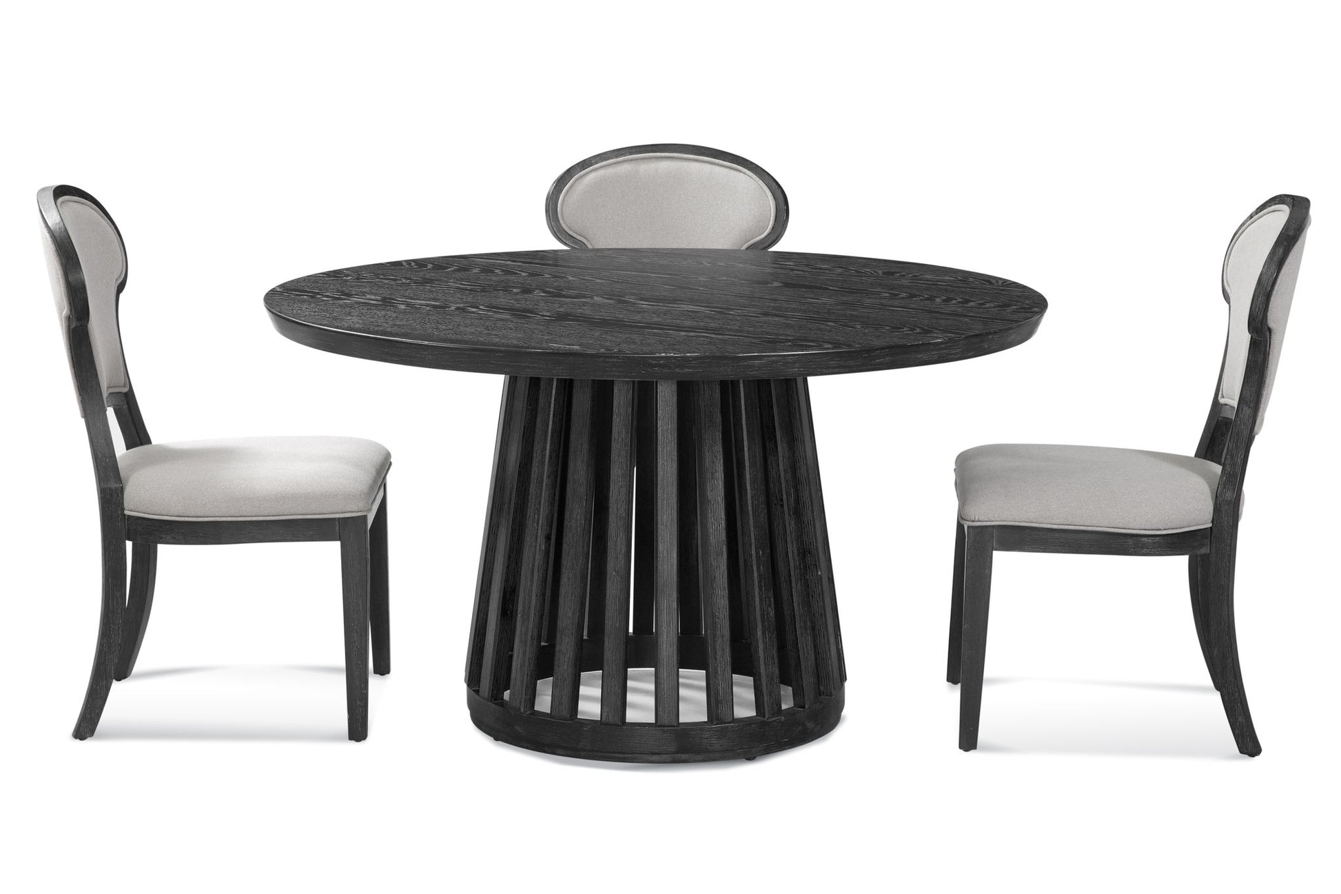 The Mateo Dining Chair features transitional styling. Features a curved seat back with tapered front legs and tapered flared back legs. The wood frame is finished in black oak veneer, complementing the gray rub-through style upholstered fabric on the seat and back. Features also include drive in floor glides on the leg bottom and a high density foam seat cushion. Seat Dimensions: 20.5"W x 18"D x 18"H.