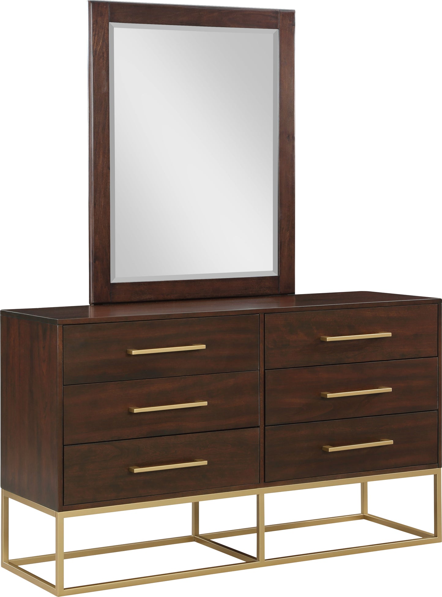 Inject bold, modern styling into your bedroom with this Maxine dresser. The dresser's contemporary design is nothing short of stunning, with unassuming lines and eye-grabbing hardware. A rich finish is modish and up-to-the-minute, while the brushed metal legs and drawer handles give this unit added flair. A metal base raises the dresser from the floor for a noticeably upscale vibe. Fill this dresser's drawers with essentials for keeping your bedroom space clean and neat.