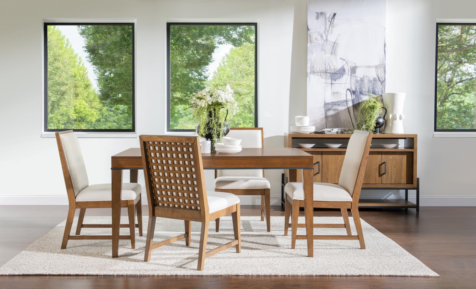 The Midland total home collection offers a heartland-inspired,, feel-good casual look that seamlessly blends styles from casual transitional to modern,, and from Craftsman to Boho. Featuring a Warm Amber finish and Matte Black hardware,, each piece is crafted from Hardwood Solids and Walnut. A standout element of the collection is the wood basket weave design,, elegantly showcased on chair backs,, door fronts,, and the panel headboard. With a young and fresh vibe,, the collection includes bedroom,, dining,, occasional,, home office,, and home entertainment.