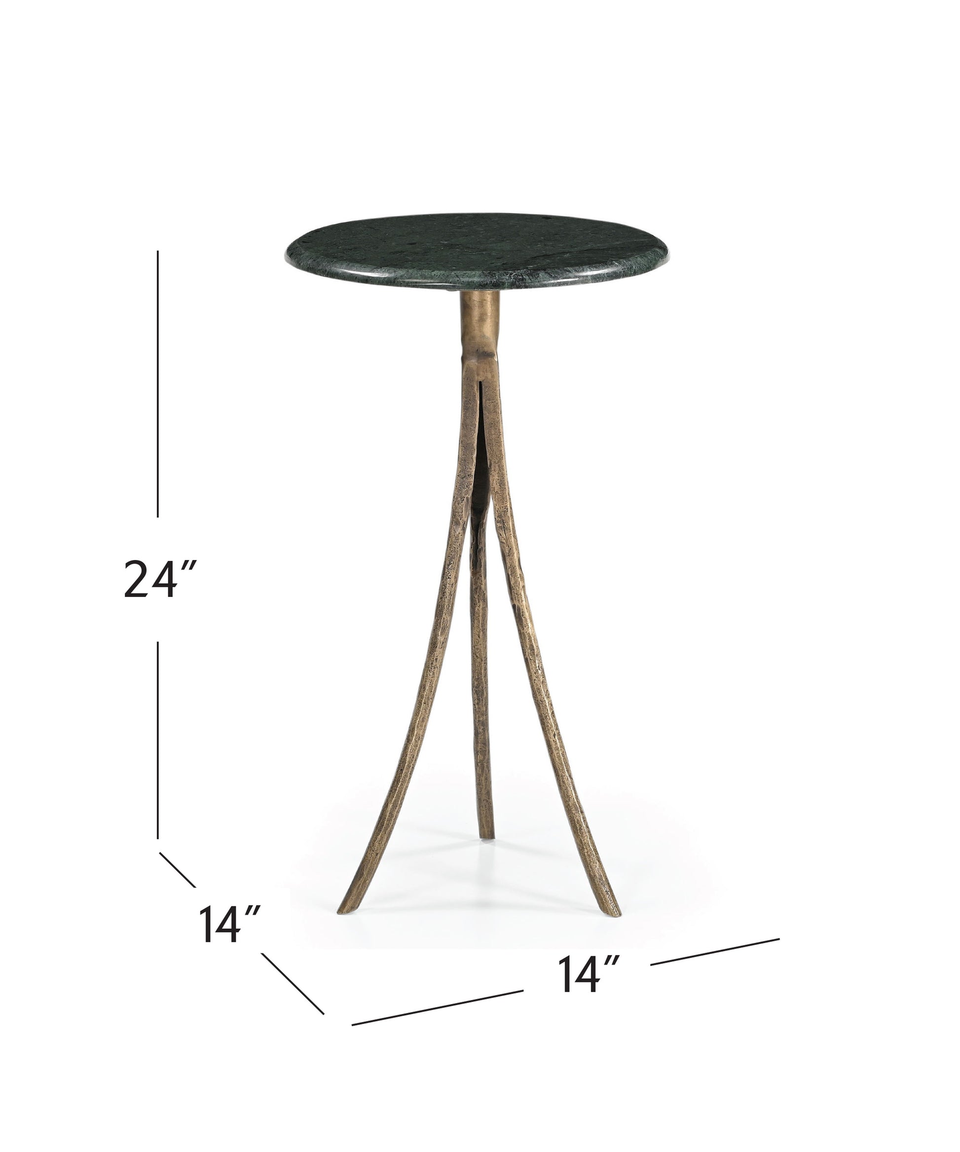 The Milo accent table embodies modern sophistication with its stunning emerald green marble top and antique brass-finished iron base. Its three-legged design, featuring hammered texture details, adds a touch of uniqueness to any room. Crafted from natural marble and hammered metal, each piece boasts its own distinctive characteristics, making it a truly one-of-a-kind addition to your space.