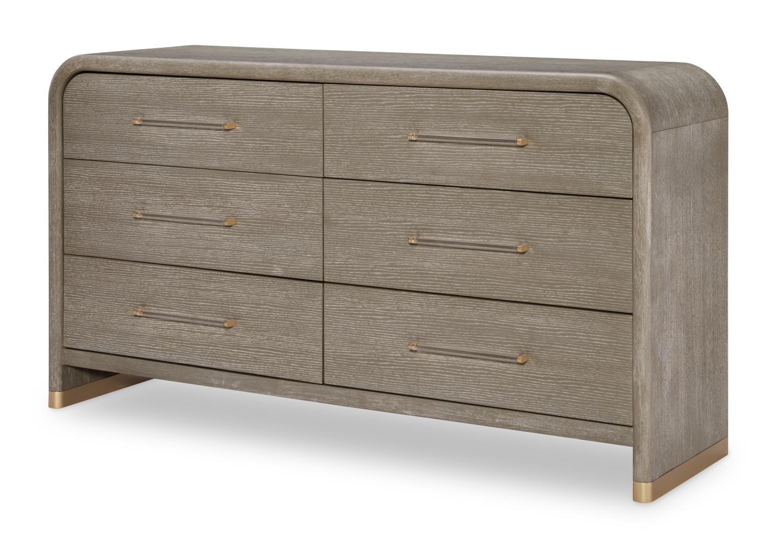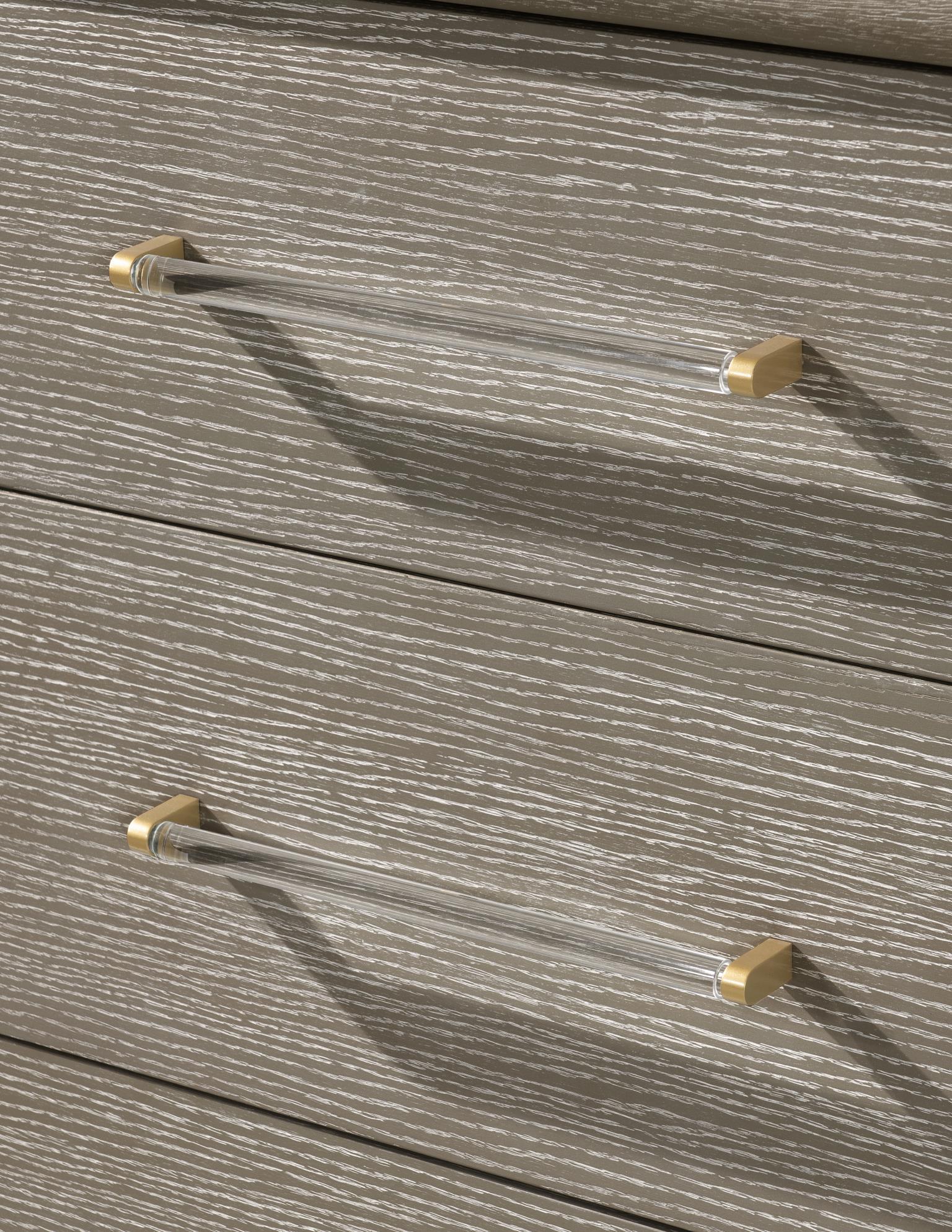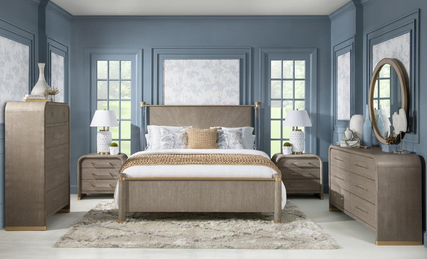 Approachable glamour. That's the look of the Miramar Total Home Collection from Legacy Classic - Modern. The collection features and acrylic accents bold fluting detail and waterfall edges. The accent finish is used in banding on case bases and foot rails table bases and on the posters of the Canopy Bed and low-post bed.