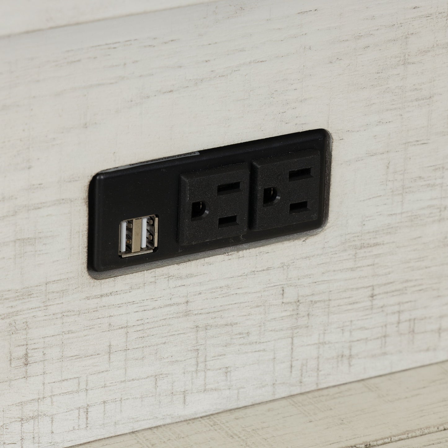 Elevate your space with the Modern Farmhouse console bar table. Crafted of poplar solids with knotty white oak veneers, this piece features heavy distressing, appealing high-low planked top, two plug receptacles and USB ports for easy access charging, with room to comfortability fit three barstools. Also available in an alternate finish, this modern farmhouse piece would be a great addition to your cottage or contemporary style space, especially behind your sofa.