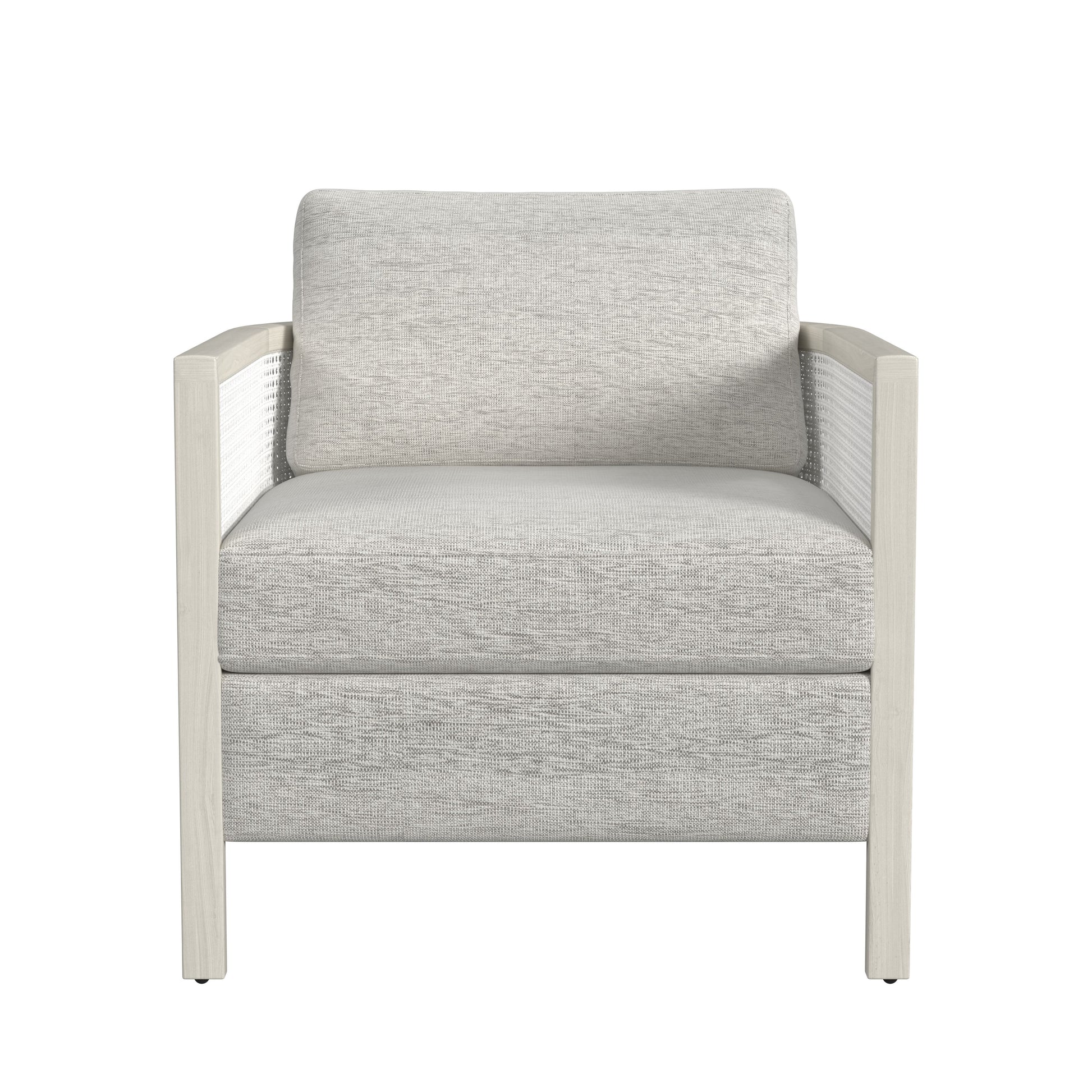 Mylo Accent Chair features a coastal farmhouse inspired design with a solid wood chair frame with double-layered open cane that wraps around the entire silhouette. There is a wood frame and caning that are hand-brushed and padded for a lightly distressed feel. Cool, oyster color fabric combines subtle boucle circle yarn with a cotton-like flat yarn to create a soft handwoven, linen-like feel. Ships fully assembled. The durable and sturdy seat features webbed construction and 35 density A-grade foam in seat.