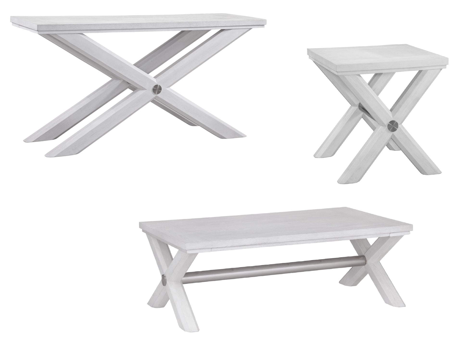 The Nadine Cocktail Table features a coastal contemporary inspired design that is constructed with solid wood and veneers in a bright white oak finish the table base features a heavy octagonal shaped X-base and a brushed nickel finished metal cross-bar. Finish: bright white, brushed nickel. Material: solid wood, wood veneers, metal..