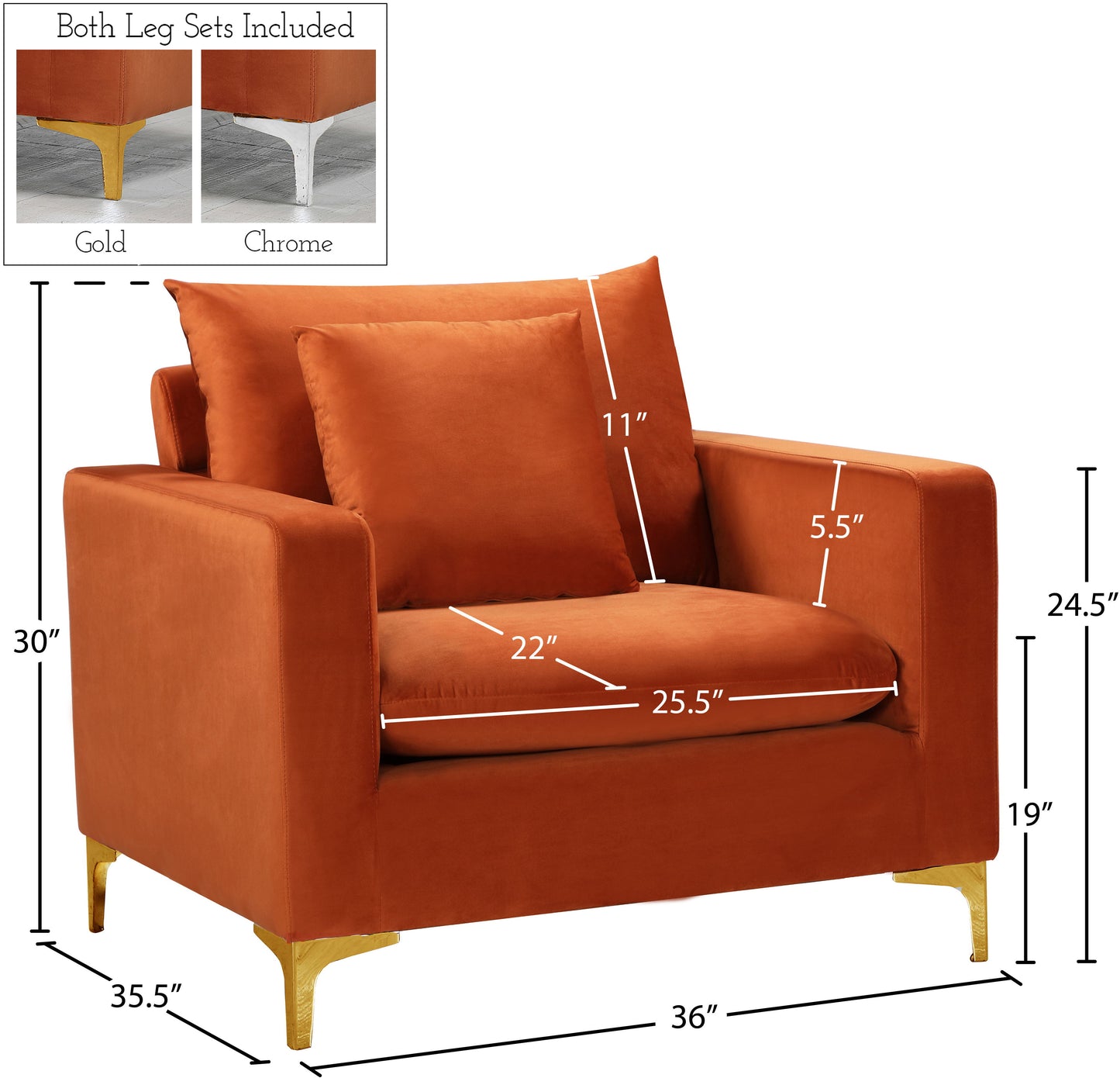 Curl up with a good book from the welcoming confines of this Naomi Chair. The color of this chair adds a bold touch to your decor and shakes up otherwise neutral color schemes. Plush velvet material feels cozy and comfortable against your skin, while deep seat cushions provide lots of room for you to stretch your legs. This chair comes with both and legs, so you can customize its look to meet your decor plans. Pillows are included for added homey warmth and comfort.