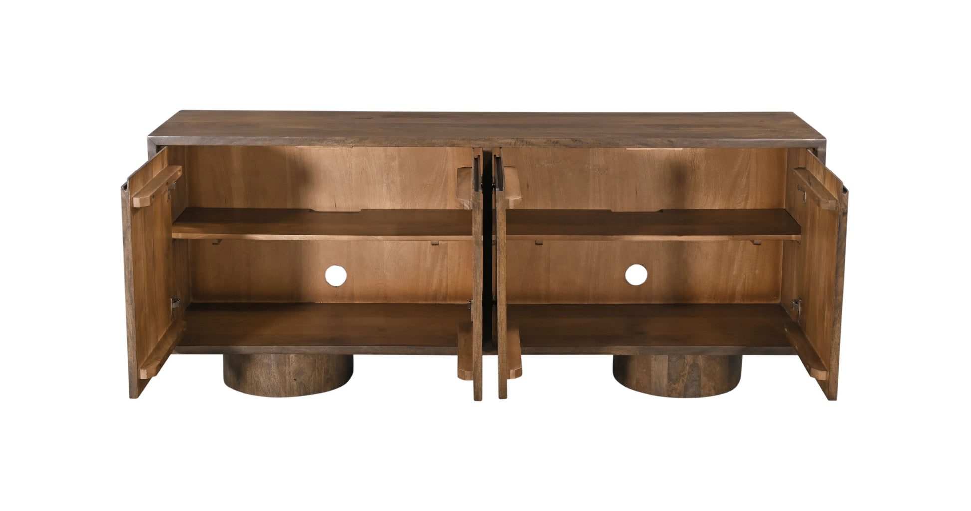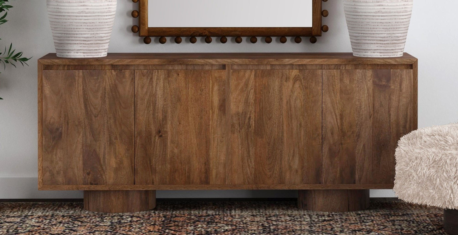 The Napa Server seamlessly blends modern and rustic elements, making it a versatile addition to any space. Crafted from brown mango wood, this 72" server features a minimalist design with overstated column-style legs and relief cuts in the doors for finger-pulls, enhancing its aesthetic appeal. Inside, you'll find two adjustable shelves and media cord management, offering practical storage solutions for your dining essentials. Hand-crafted with natural solid mango, each piece boasts unique variances in grain, adding to its rustic charm.