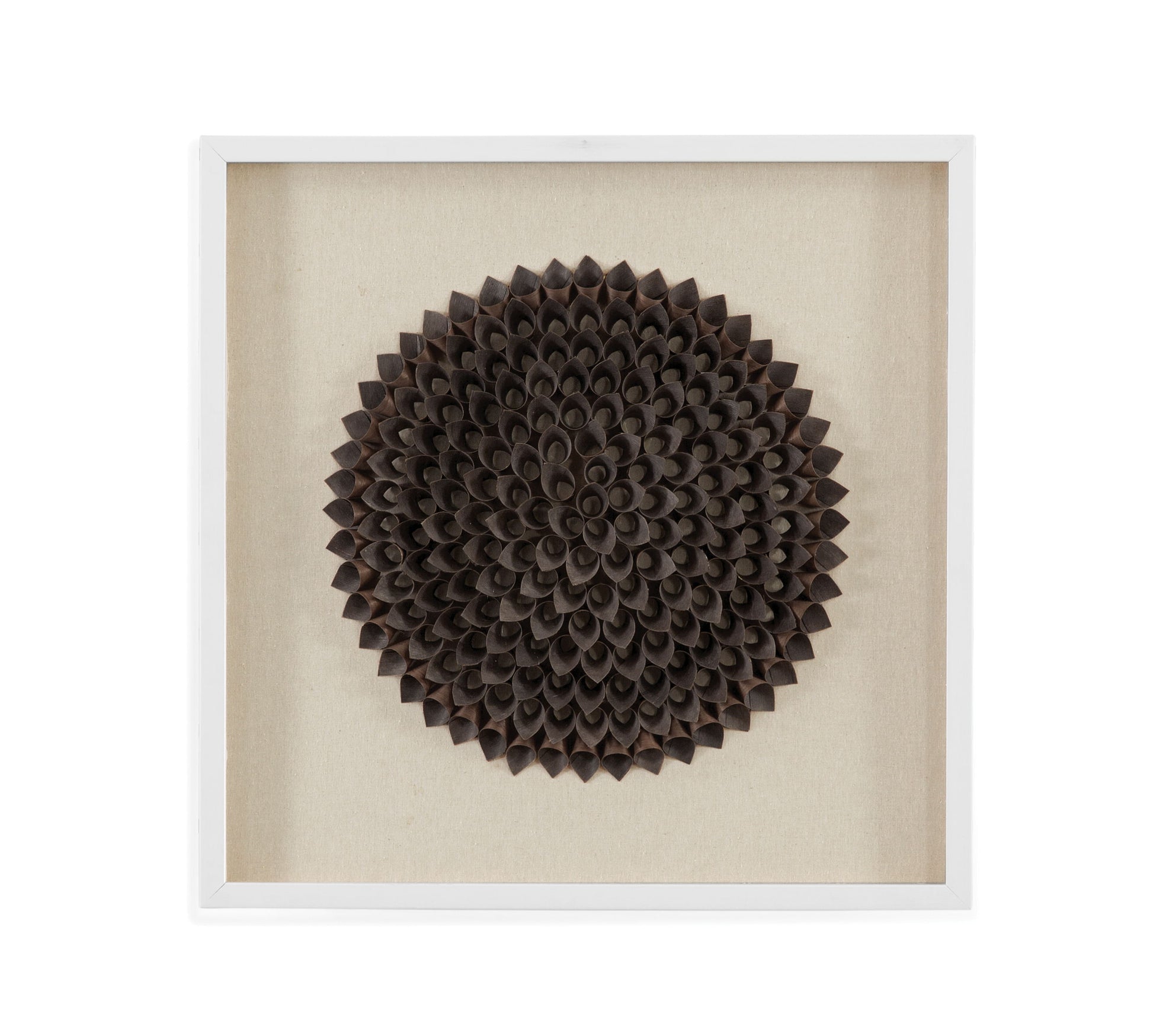 Nature Wall Art is a shadow box accentuated with a linen-like oatmeal colored mat and a floral pattern of rolled cutouts of natural fibers and white modern frame. PS. 7.27 LBS.