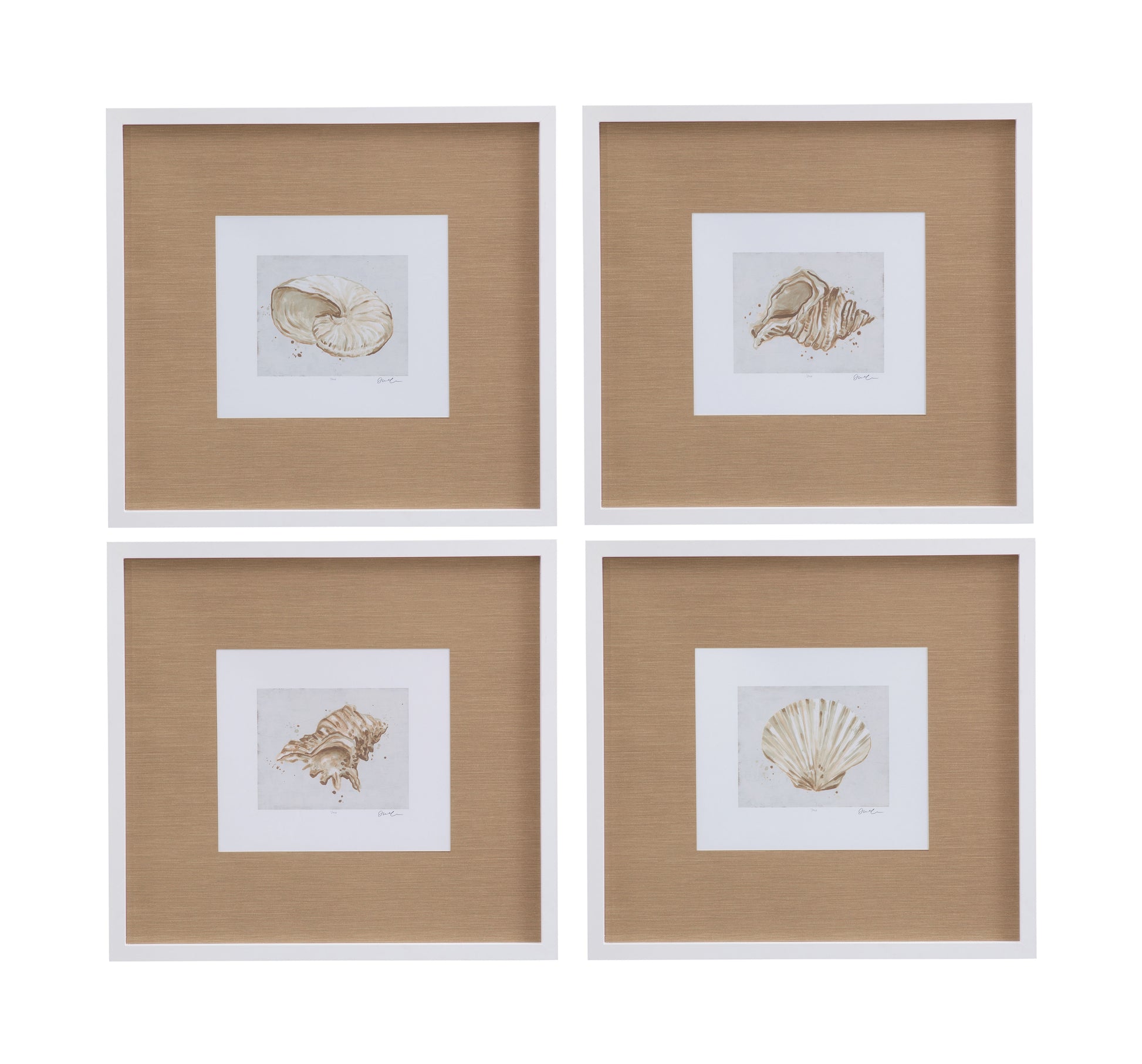 Neutral Shell Fresco III is a limited edition print, signed and numbered by the artist and printed on fine art cotton rag paper. The print is framed in a matte white frame with a textured tan mat board.