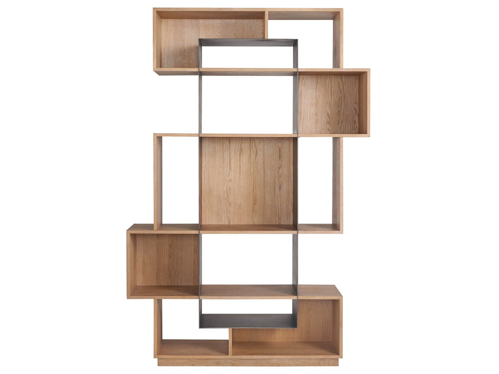 The Jaxon Etagere is a nod to mid-century design, finished in a warm medium Oak and accented with aged Satin Pewter details. Its structure is a masterpiece of geometric abstraction, offering ample shelf space in an artistic arrangement. This piece brilliantly manipulates space, making it both a functional storage solution and a striking decorative element.