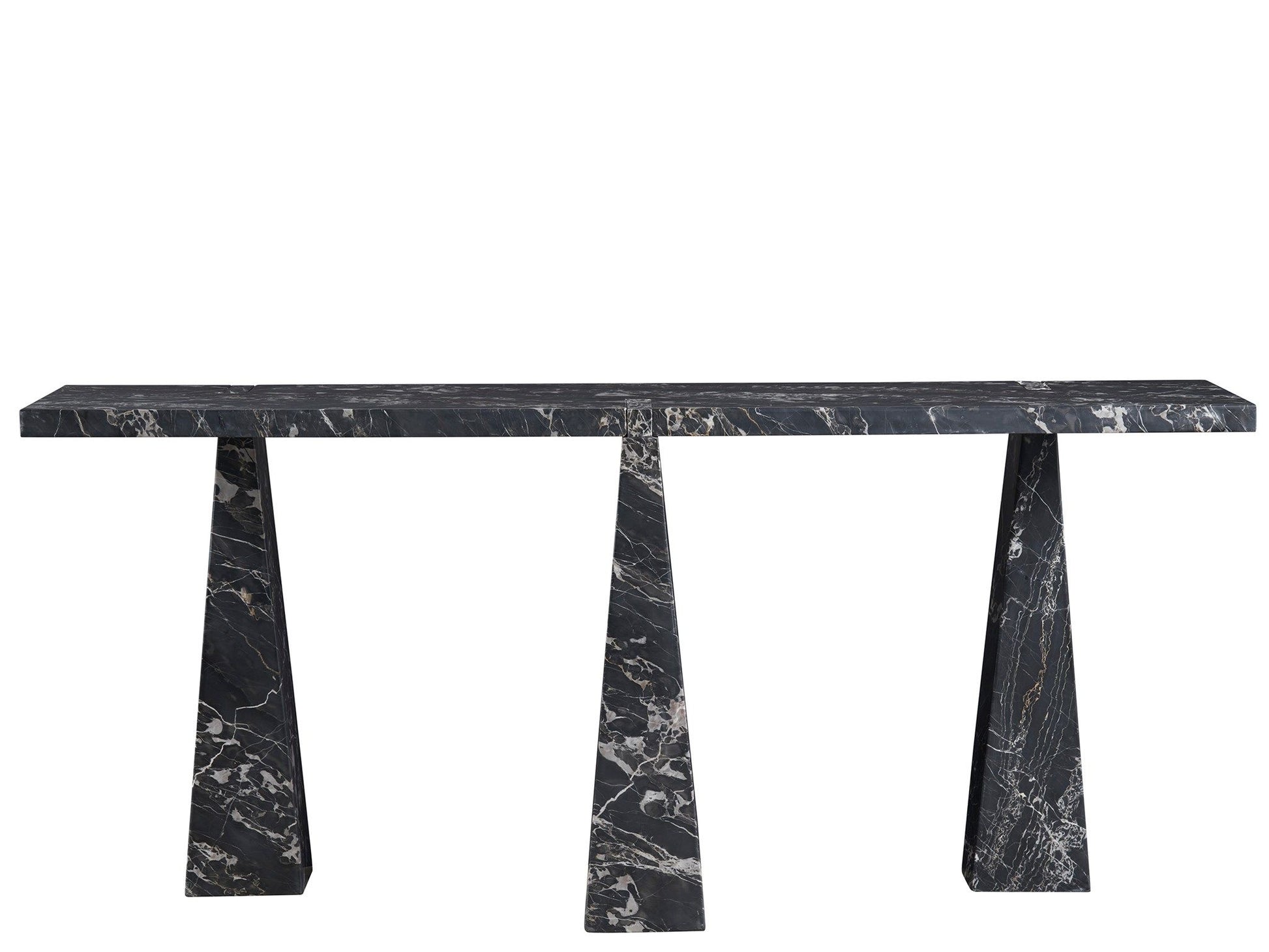 The Spectrum Sofa Table is a masterpiece of drama and depth, sculpted entirely from Golden Portoro marble, characterized by its rich, moody tones and striking white veining. Its legs, architectural and sculptural in form, draw inspiration from triangular shapes, adding a layer of intrigue and sophistication to this captivating piece.