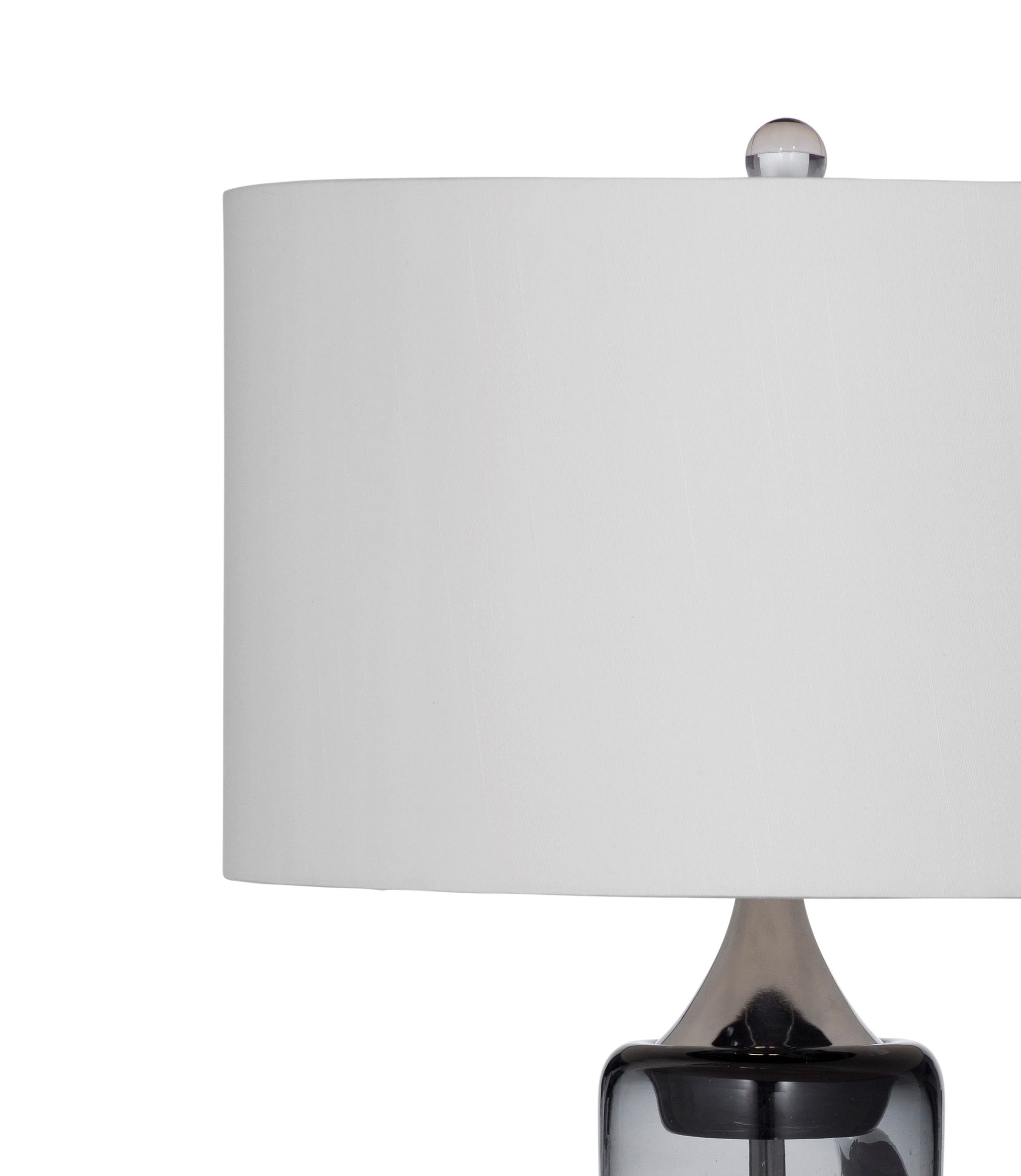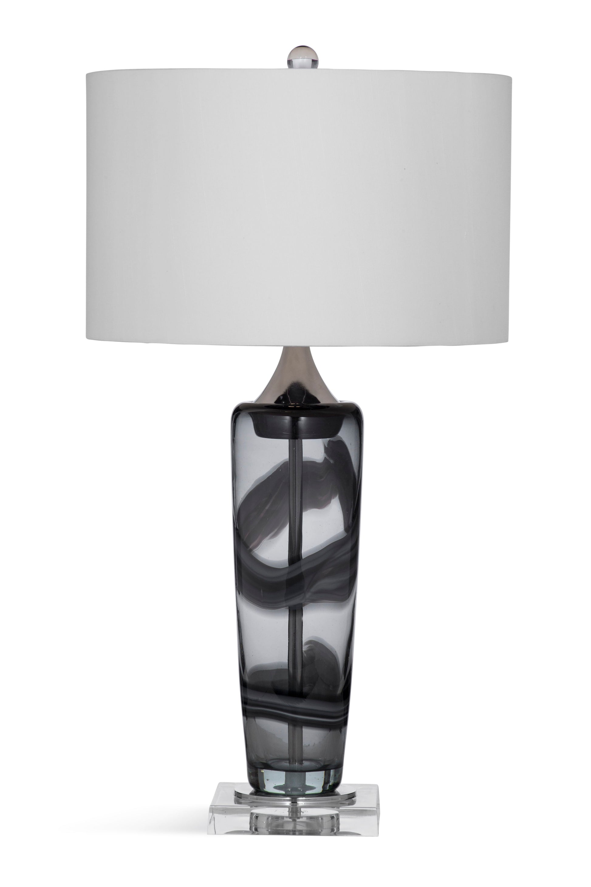 The Nikola Table Lamp captivates with its wispy gray strokes and sleek white drum shade, casting a shadowy yet alluring glow. Perfect for modern spaces, this lamp adds a mysterious element, infusing your room with intrigue and sophistication. Crafted with glass and topped with a faux silk drum shade in crisp white, the Nikola Table Lamp is a statement piece that effortlessly elevates your decor.