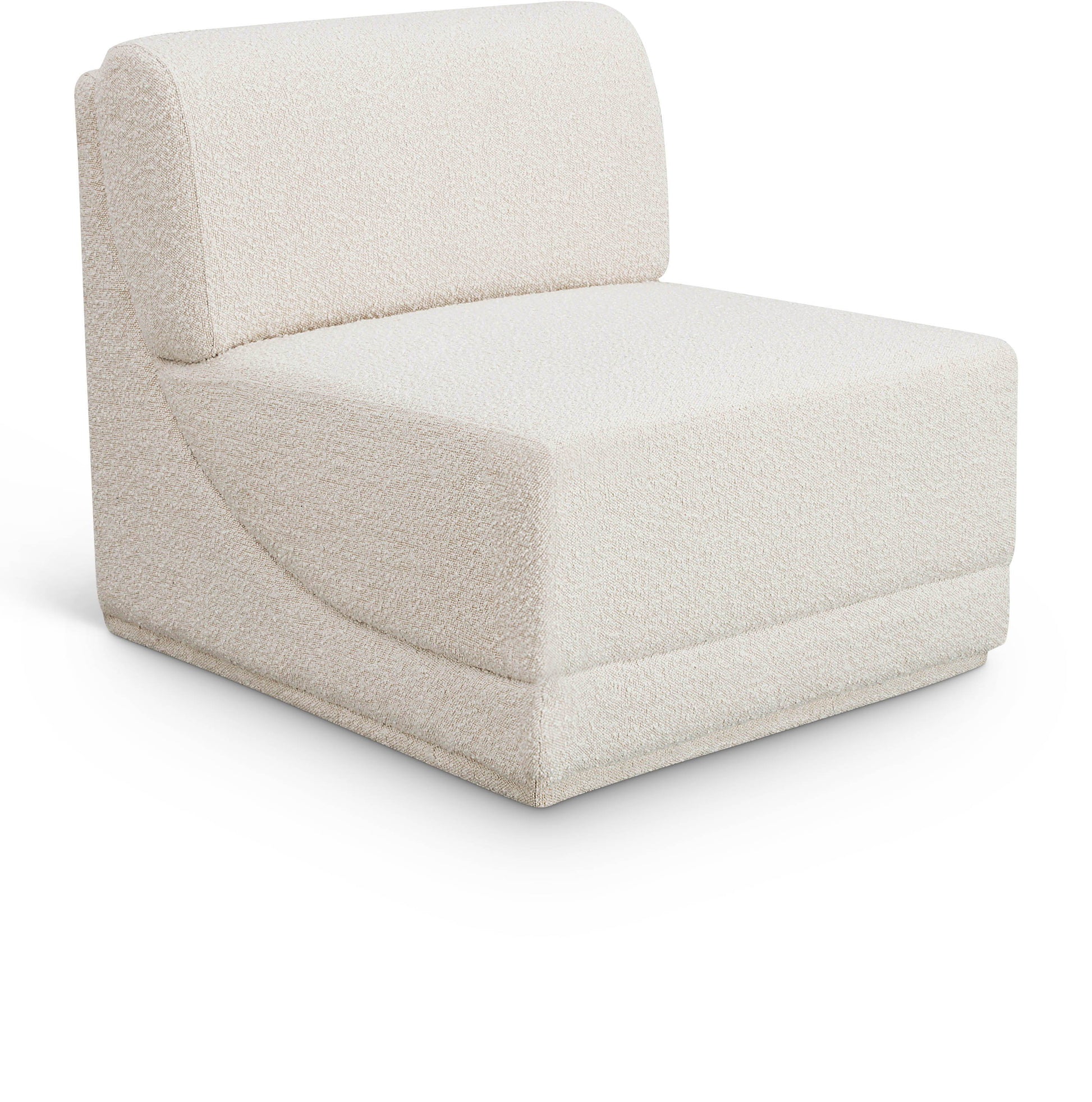 Meet the epitome of style and functionality with this Ollie boucle fabric living room chair, part of the Ollie modular collection. A contemporary marvel, this chair features chic and inviting rich boucle fabric upholstery, giving it a sumptuous texture that oozes elegance and luxury. Curved corners add to the visual look of the chair while maximizing seating comfort while lounging, reading, or entertaining. Pair it with other items in the Ollie collection easily, thanks to an attachment latch underneath.