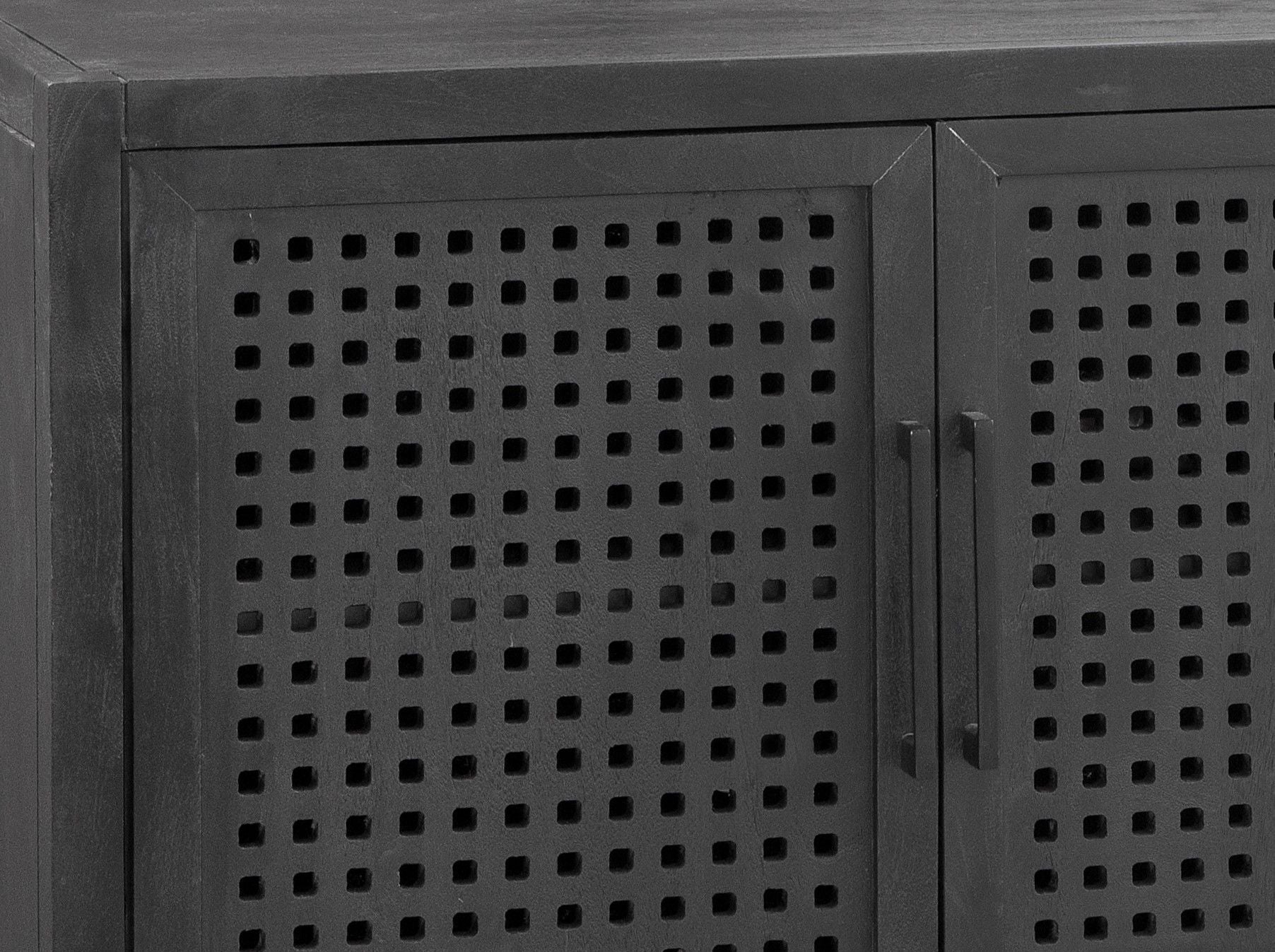 The Pentak Server will be the highlight of the room, with it's natural wood and boho-industrial style. This large server features sand blasted natural mango wood in a matte black finish. The front four doors are accented with open-pierced fretwork detailing and large metal door pulls. Inside has plenty of storage space with two fixed interior shelves and media cable management cutouts. Other features include soft close hinges, magnetic door stops and adjustable floor levelers. Natural mango wood is a product of nature and is completely unique. The natural material is subject to variations in characteristics such as color, density, grain and finishing.