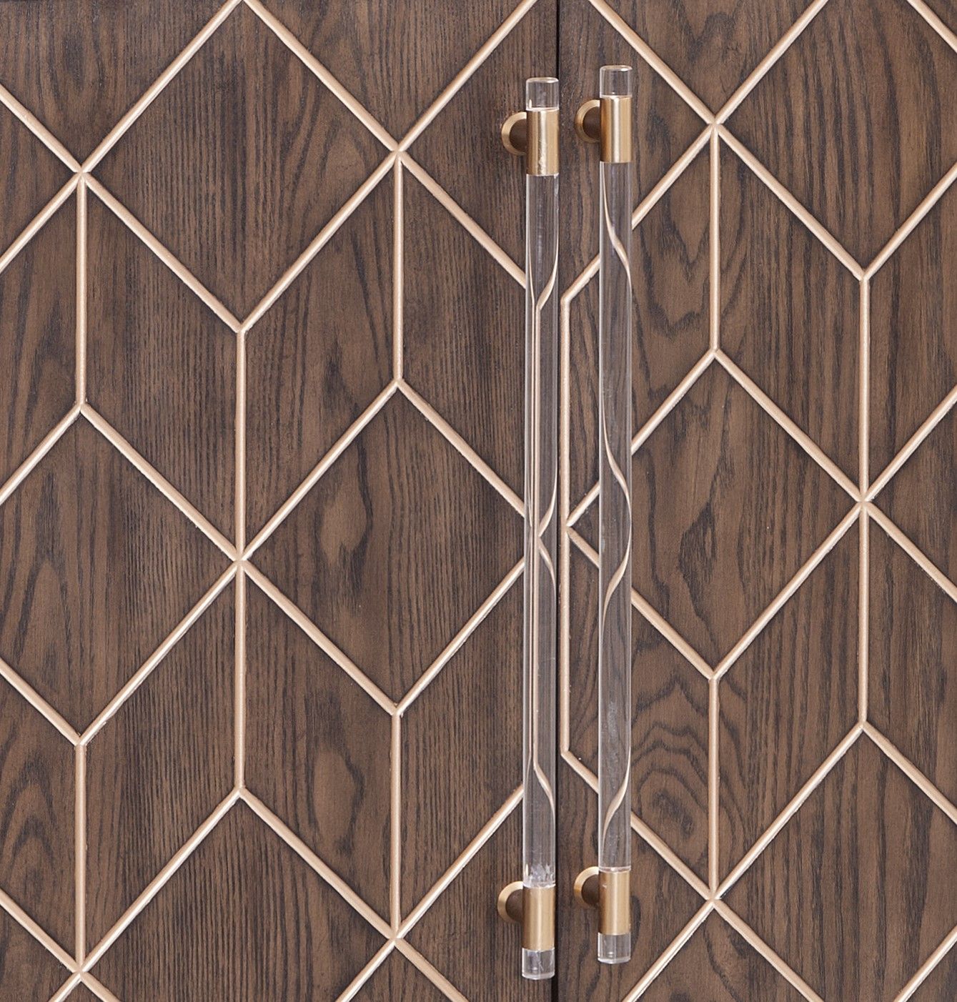 - Acrylic door pulls were custom designed with satin brass mounts
