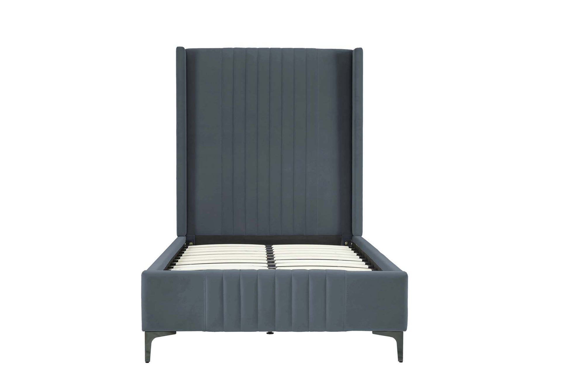 Mid-Century Modern Twin Bed Frame with Headboard for Bedroom Use. * Upon Assembly, Dimension Measures: 83.3 in. Length, 59.3 in. Height, 44.1 in. Depth * Upholstered In Luxurious Velvet with High Density Foam Filled Padding. * Features a Vertical Stitched Headboard. * Recommended Twin Mattress Size: 75 in. * 39 in. * Leg Height: 5.3 in. Headboard Height: 59.3 in. * No Box Spring Needed! Solid Pine Wood Slats Included. * Minimal Home Assembly Required. All Hardware Included