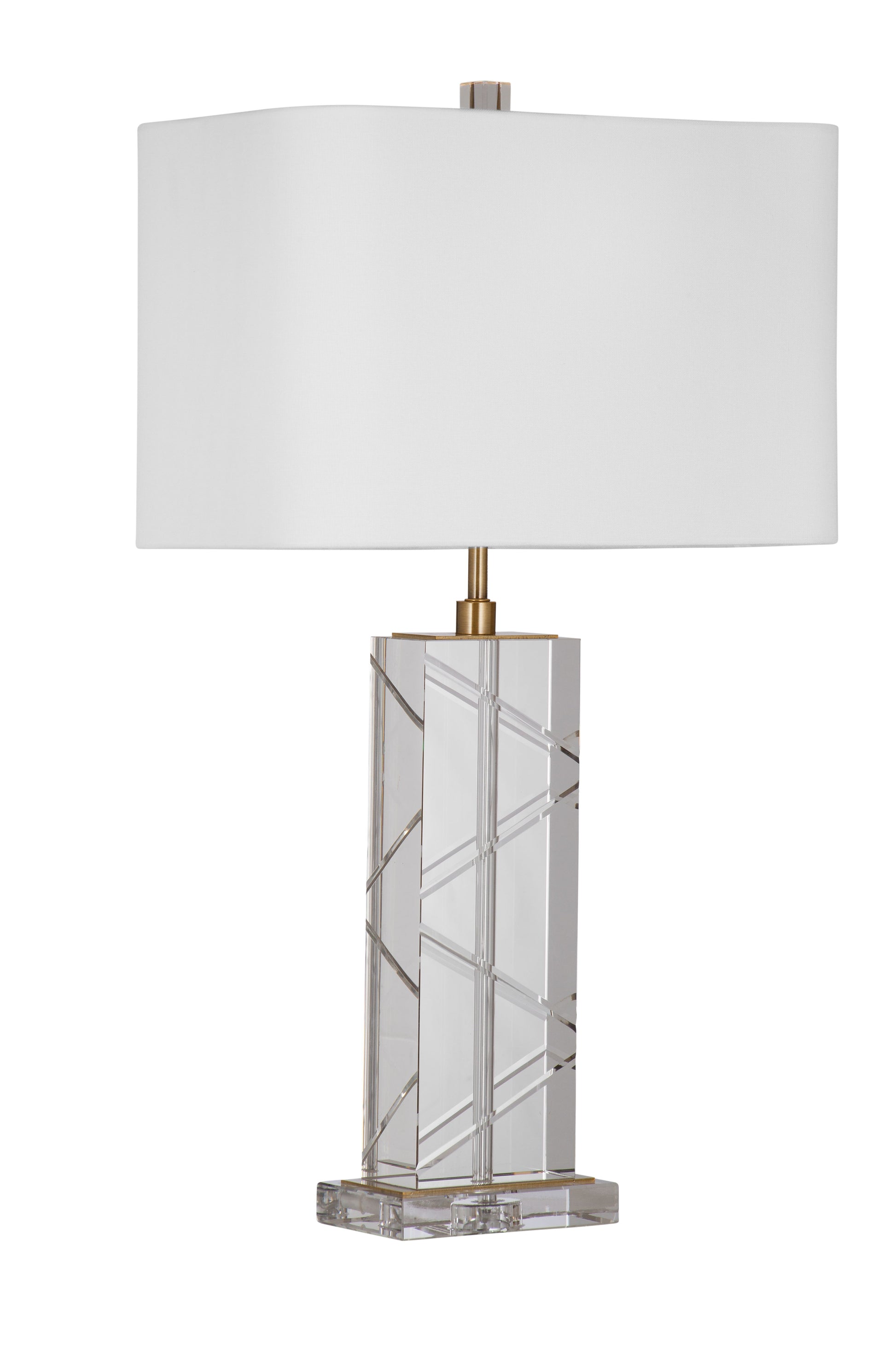 The Sahi Table Lamp is crafted of clear cut crystal with a white rectangular shade.
