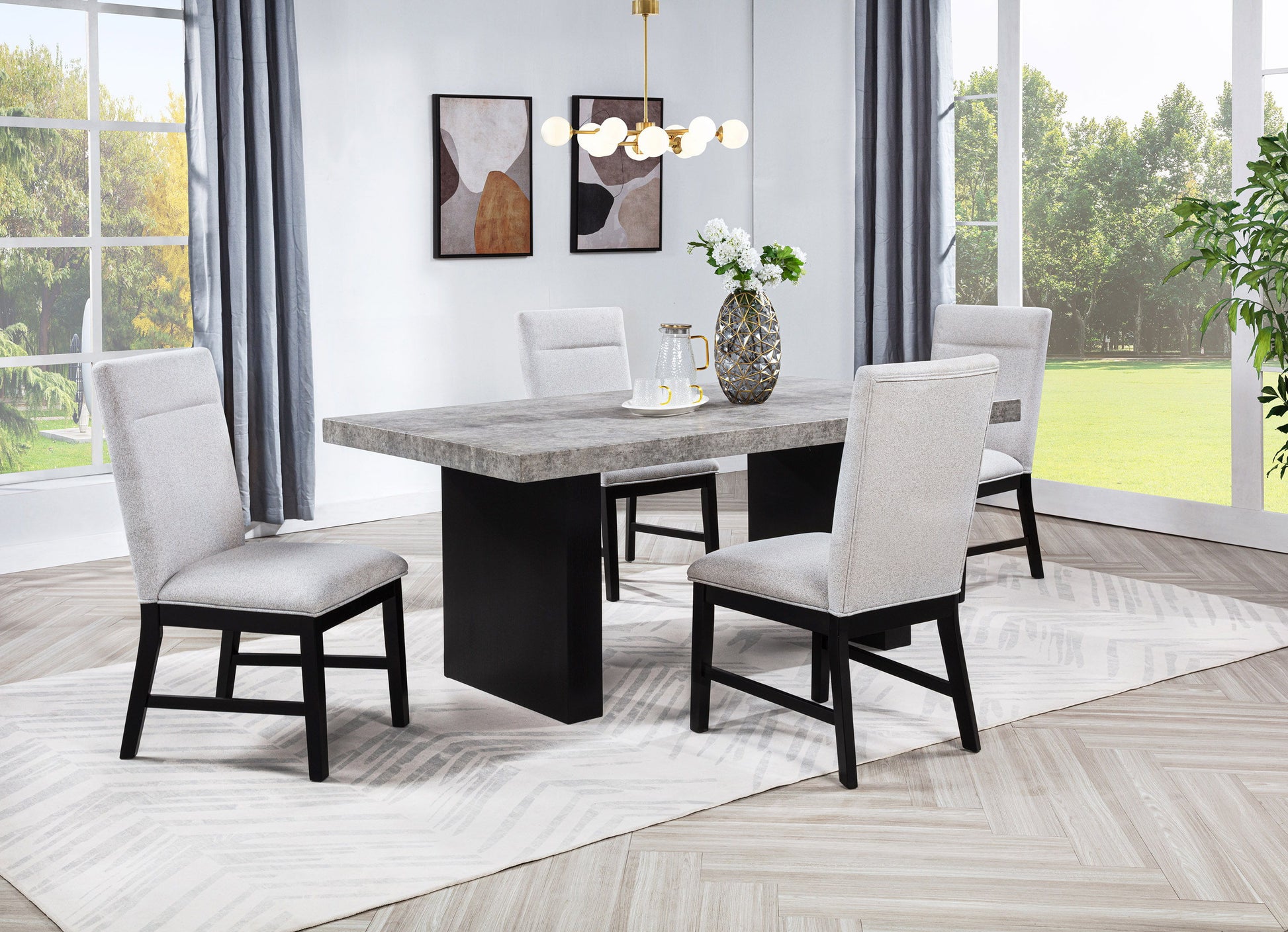Elevate your dining experience with this contemporary ensemble that perfectly balances style and functionality. Featuring a bold, concrete-inspired tabletop and sleek black supports, this centerpiece is both striking and durable, ideal for modern living. The complementary seating combines plush, light-grey upholstery with robust black frames, delivering unmatched comfort and elegance. The addition of a bench adds versatility, making it perfect for casual gatherings or formal meals. Designed to harmonize with a variety of décor styles, this set blends modern minimalism with everyday practicality, ensuring your dining space is as inviting as it is stylish.