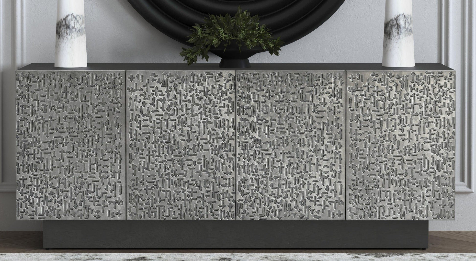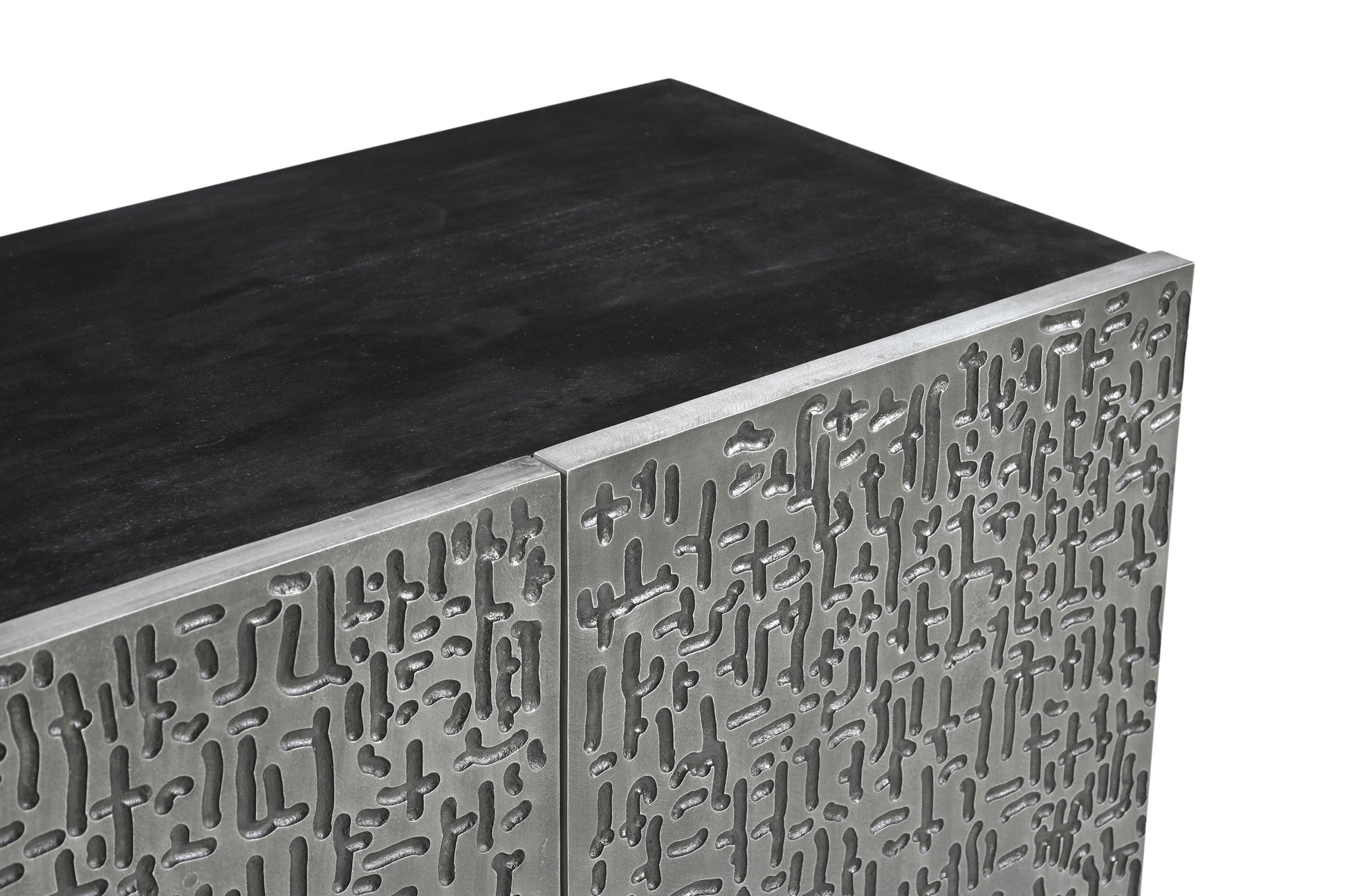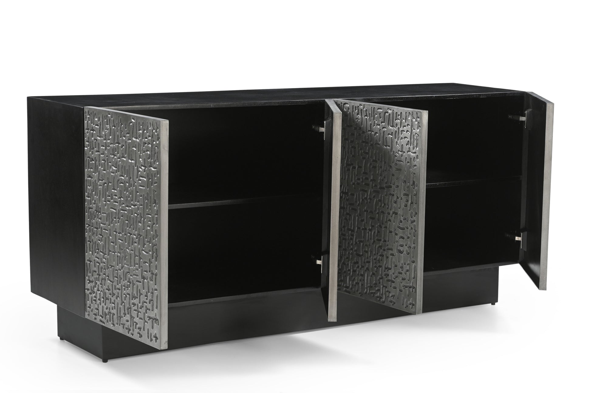 The Sevigny Server is a bold, modern inspired statement piece that commands attention. Crafted from solid mango wood in a sleek matte ebony finish, the case provides a refined and understated backdrop. The doors are the true highlight, made from cast aluminum with a striking contemporary textured design in an antique pewter finish, creating a bold contrast. Behind the four doors, adjustable shelves and media cord management ensure both style and functionality are seamlessly integrated. This server is designed to be the centerpiece of any modern space, combining striking design with practical storage.