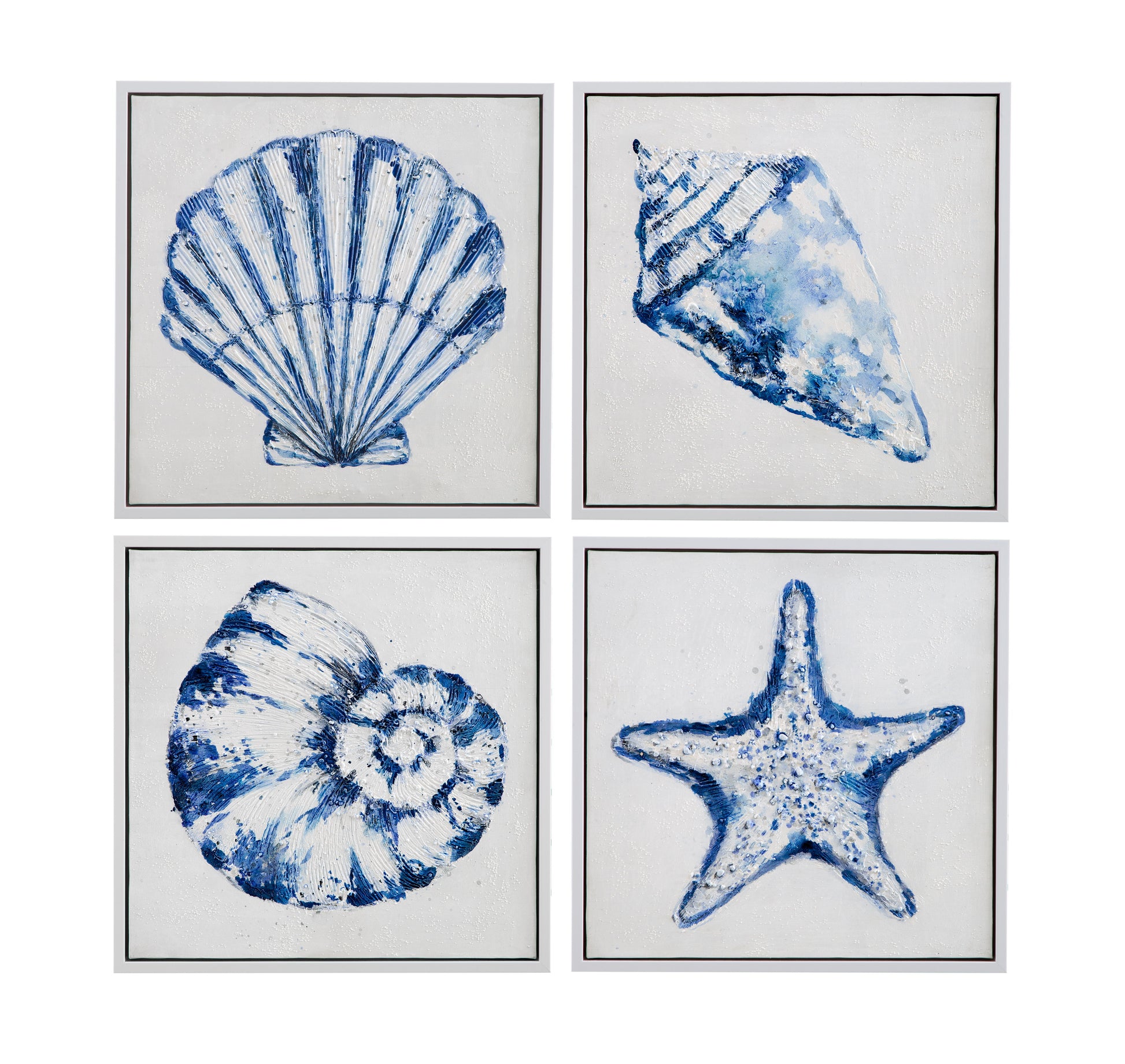 The Shells Framed Canvas set of four features a beautiful coastal design with soft white and blue hues, evoking the serene beauty of the ocean. Each canvas captures the essence of coastal living, making it the perfect addition to any space that embraces a beach-inspired aesthetic. Framed in sleek white, these pieces enhance your decor with a clean, modern look. Whether hung in a living room, bedroom, or hallway, the Shells Framed Canvas set brings a fresh, calming atmosphere to your home.
