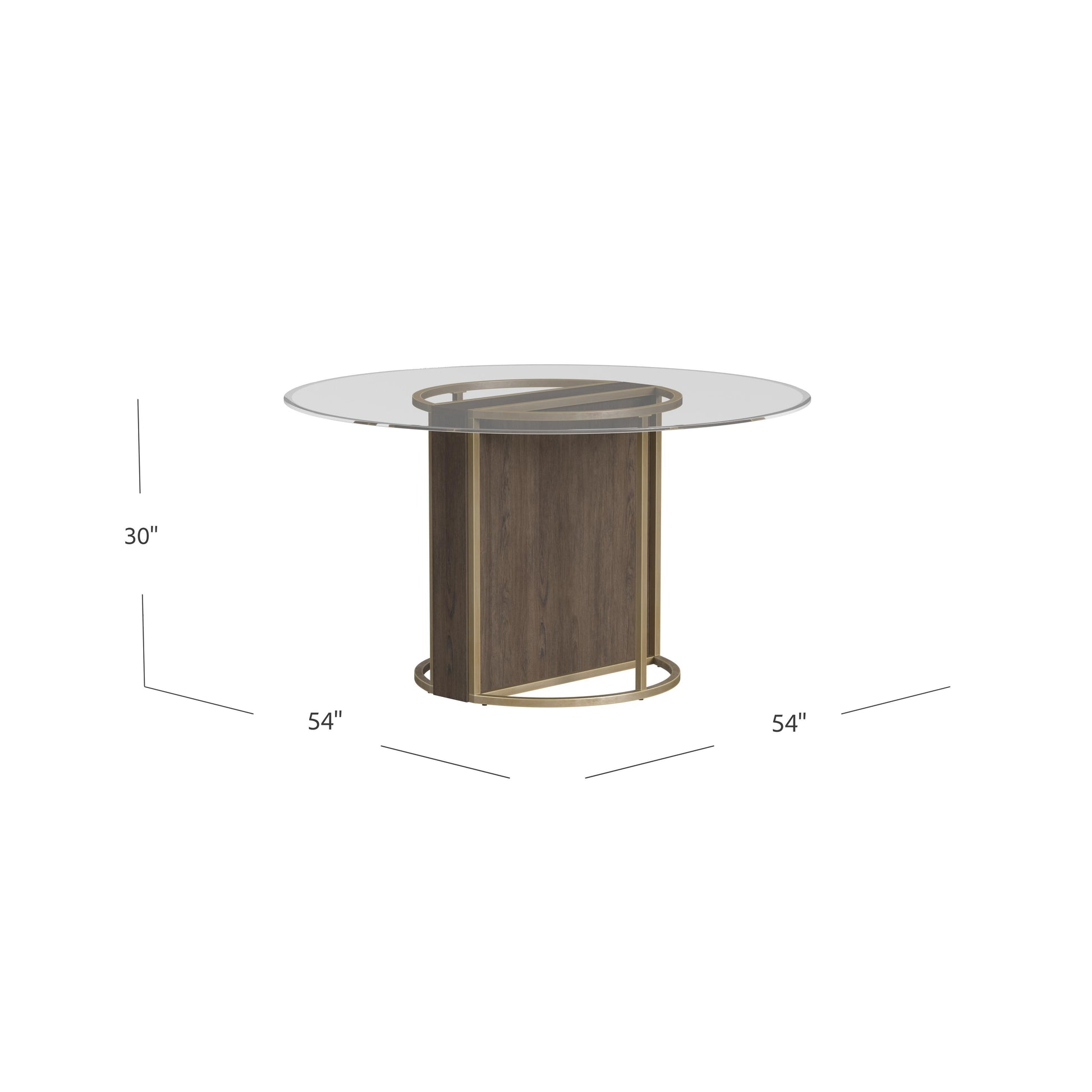 The Stefan Dining Table features a Mid-Century Modern inspired design combining a champagne metal frame and mindi veneers in a chalk gray stain. Accommodates up to a 54" glass top. Finish: champagne, chalk gray stain. Material: metal, rubberwood solids and mindi veneers. Uses up to a 54 inch glass top and can comfortably seat 4.