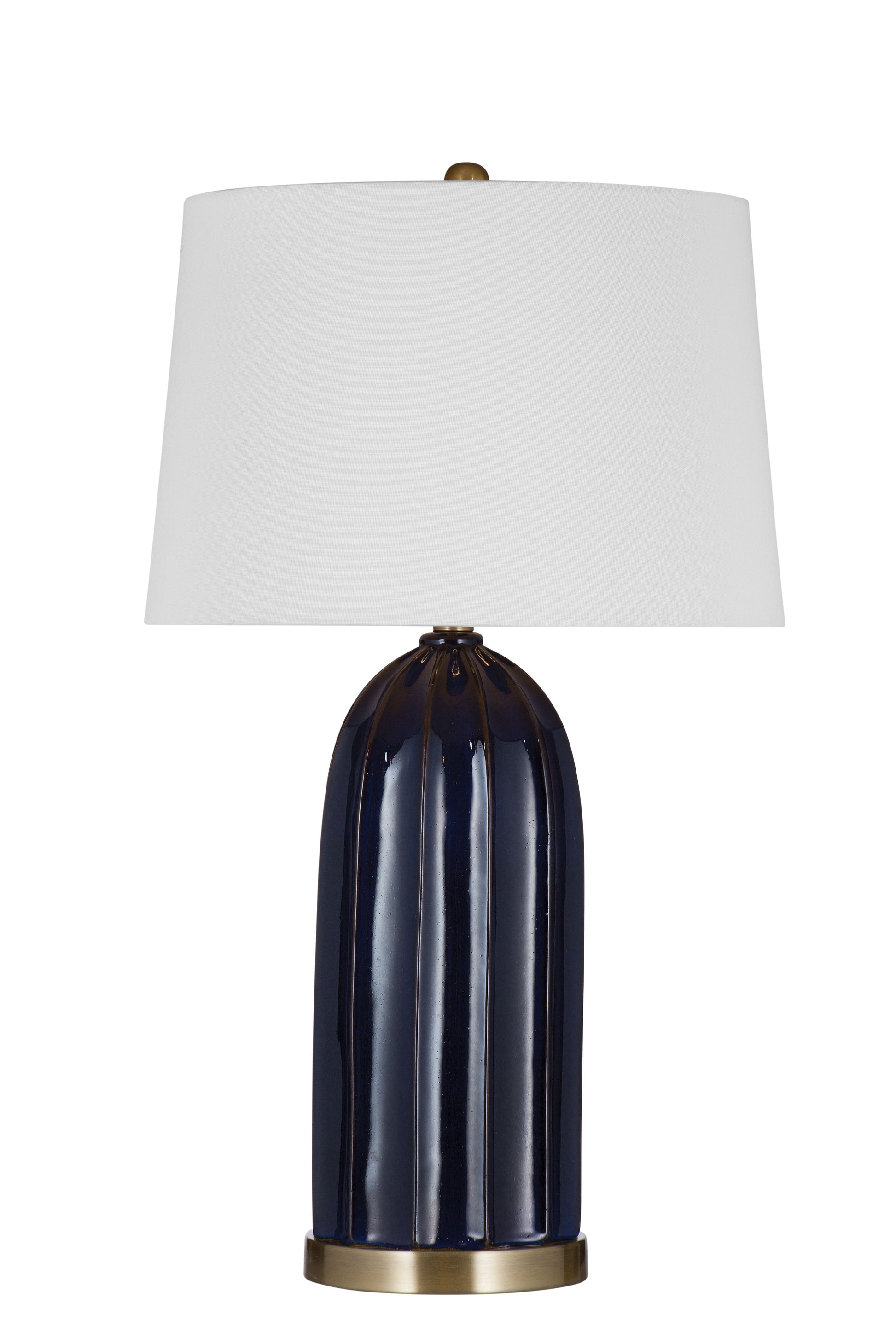 Immerse your space in contemporary charm with the Susan Table Lamp. The navy blue ceramic body, adorned with ridged detailing, seamlessly complements the antique brass base. The tapered drum-shaped lamp shade, crafted from white linen, exudes timeless elegance. Effortlessly illuminate your surroundings with the 3-way turn knob light switch, and with a generous 60-inch lamp cord, finding the perfect spot is a breeze. Elevate your ambiance with this stylish yet functional piece that enhances both your decor and lighting experience.