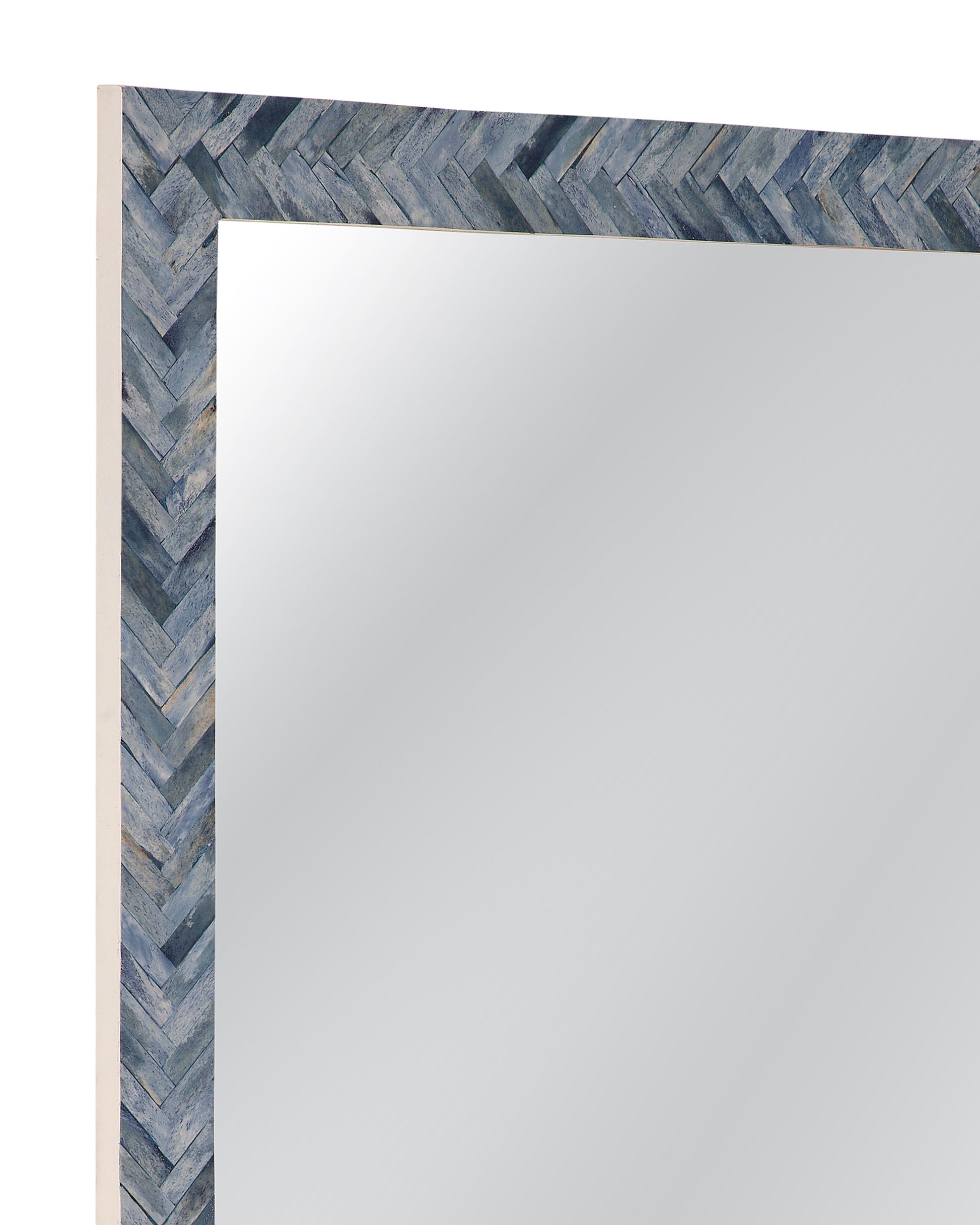 The Sutton Wall Mirror showcases a striking rectangular frame wrapped in blue bone arranged in a refined herringbone pattern. Its bold yet sophisticated design adds a pop of color and texture, making it a standout accent in modern, coastal, or eclectic spaces.