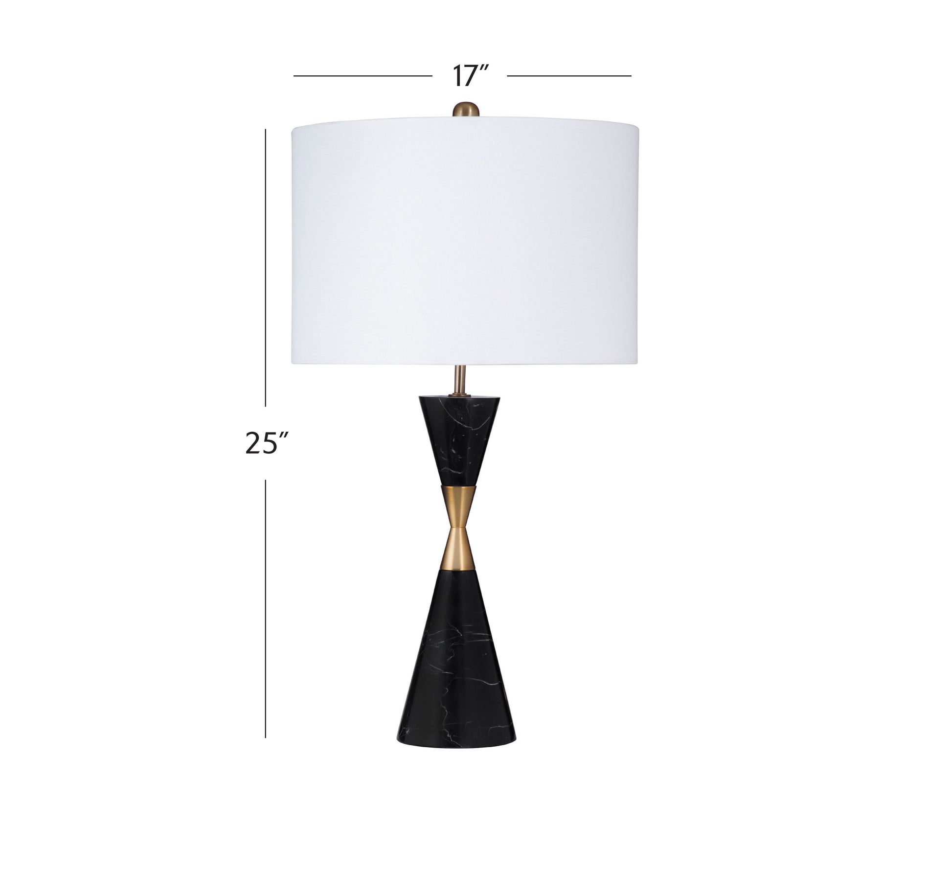 The Tana Table Lamp is a fusion of black marble and brass metal, embodying modern elegance. The tapered cone-shaped marble body, enriched with brass accents, creates a unique and sophisticated style. Complemented by a drum-shaped lamp shade in white linen, this lamp is not just a source of light but a design statement. With a convenient 3-way turn knob switch and a 60-inch cord for flexible placement, the Tana Lamp seamlessly combines aesthetics with functionality, adding a touch of distinctive charm to your space.