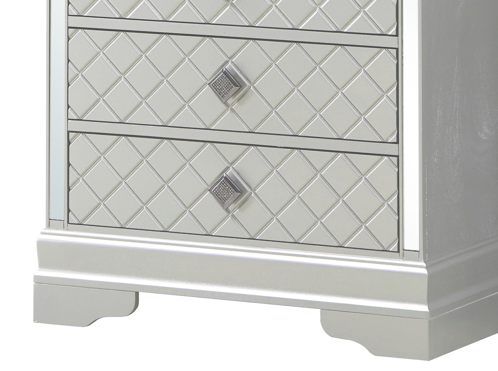 This Silver Champagne Chest elevates your bedroom's design with its captivating modern aesthetic. The unique embossed 'X' design beautifully enhances the surface while the rich wood veneers and deep finishes provide a luxurious feel and a sturdy build. The remarkable silver champagne color reflects light, creating an illusion of more space while adding shimmer to the décor. Boasting overall dimensions of 48"H X 31"W X 16"D, this chest is perfectly sized to provide ample storage while fitting seamlessly in various bedroom configurations. It serves as an effective solution for organizing clothing and accessories, contributing both functionality and style. Offering a versatile character, this chest not only meets storage needs but also adds a chic touch to your bedroom ensemble. Invest in this expertly crafted piece that balances both aesthetics and practicality for a harmonious living experience.