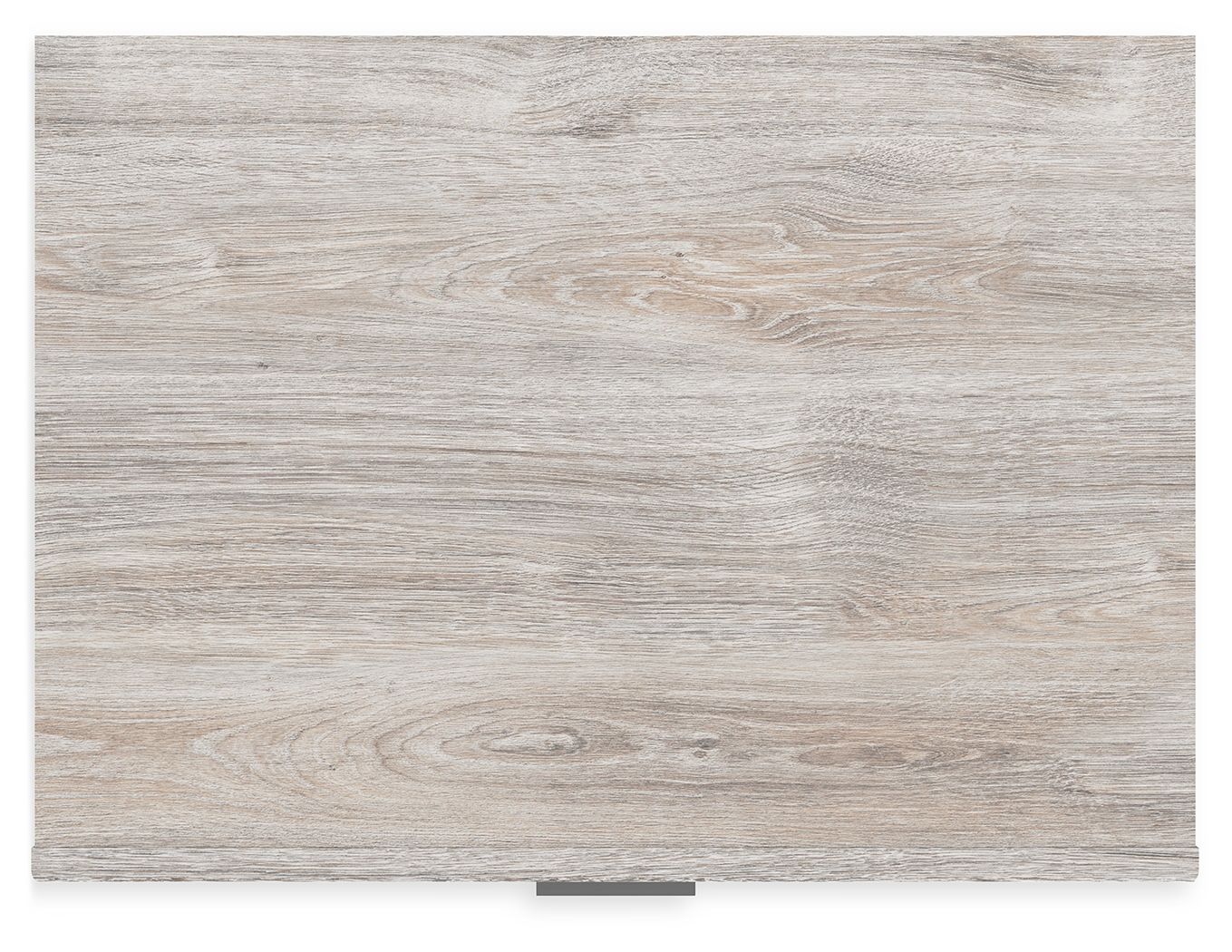 - Light gray finish over a replicated oak grain with authentic touch; base has matte black finish with subtle replicated wood grain