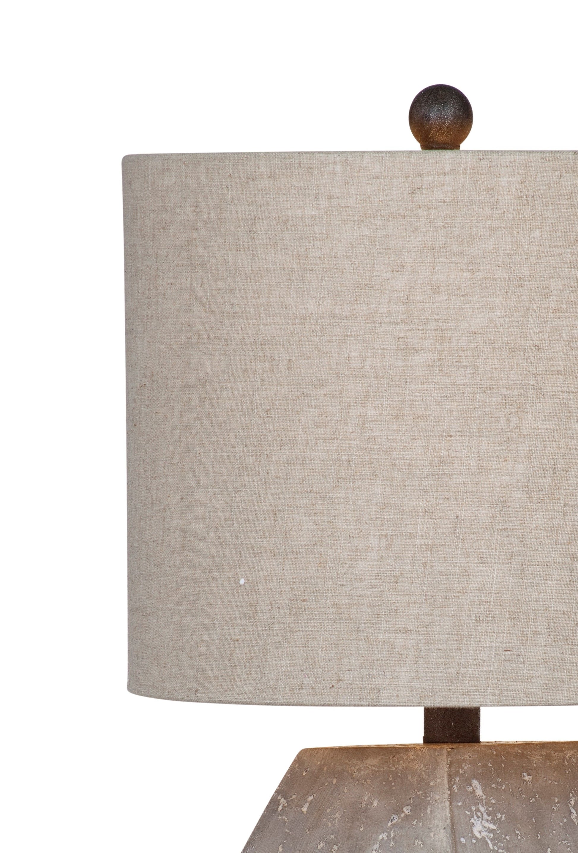 - The lamp body is constructed of gray cement with a white wash finish in a geometric sillhouette
