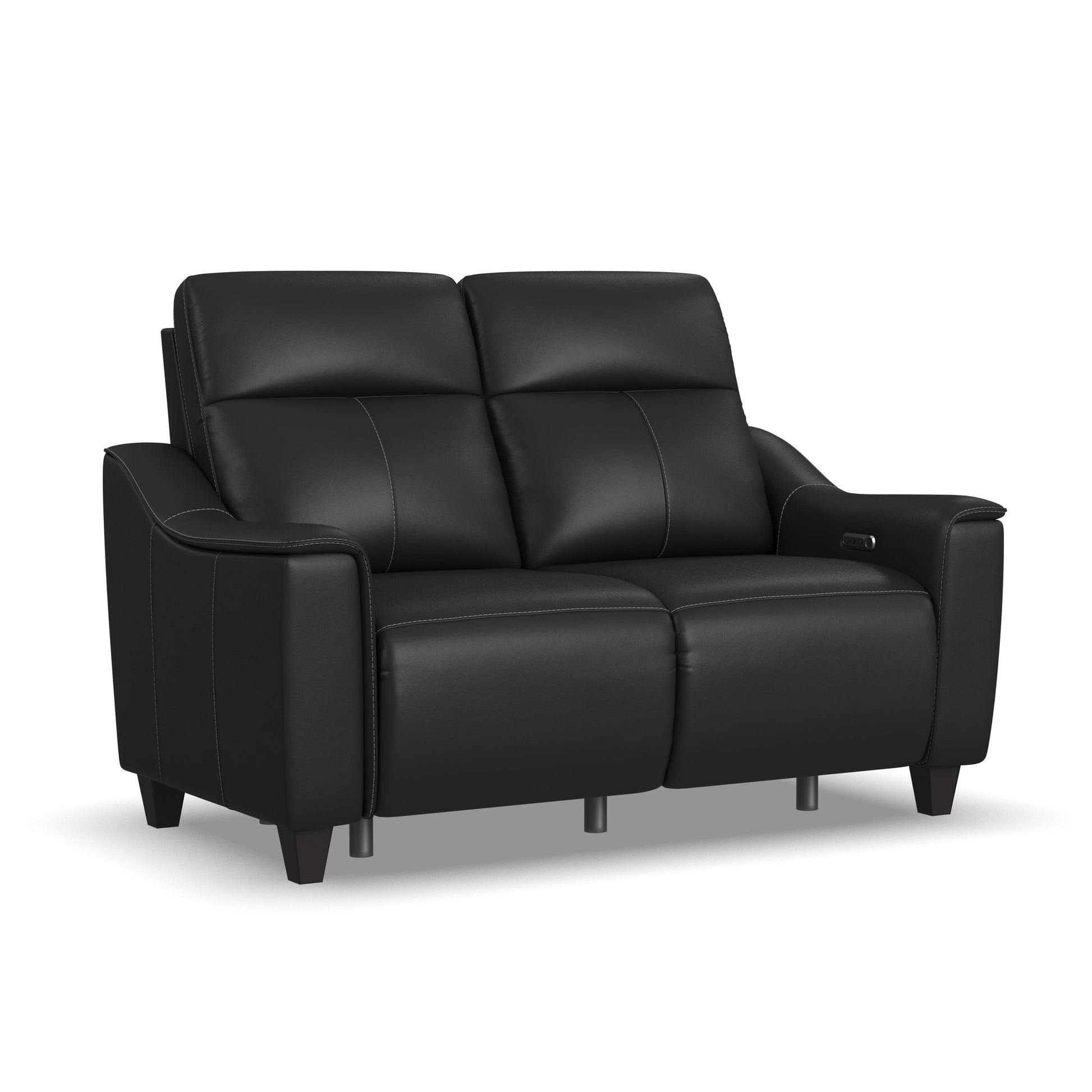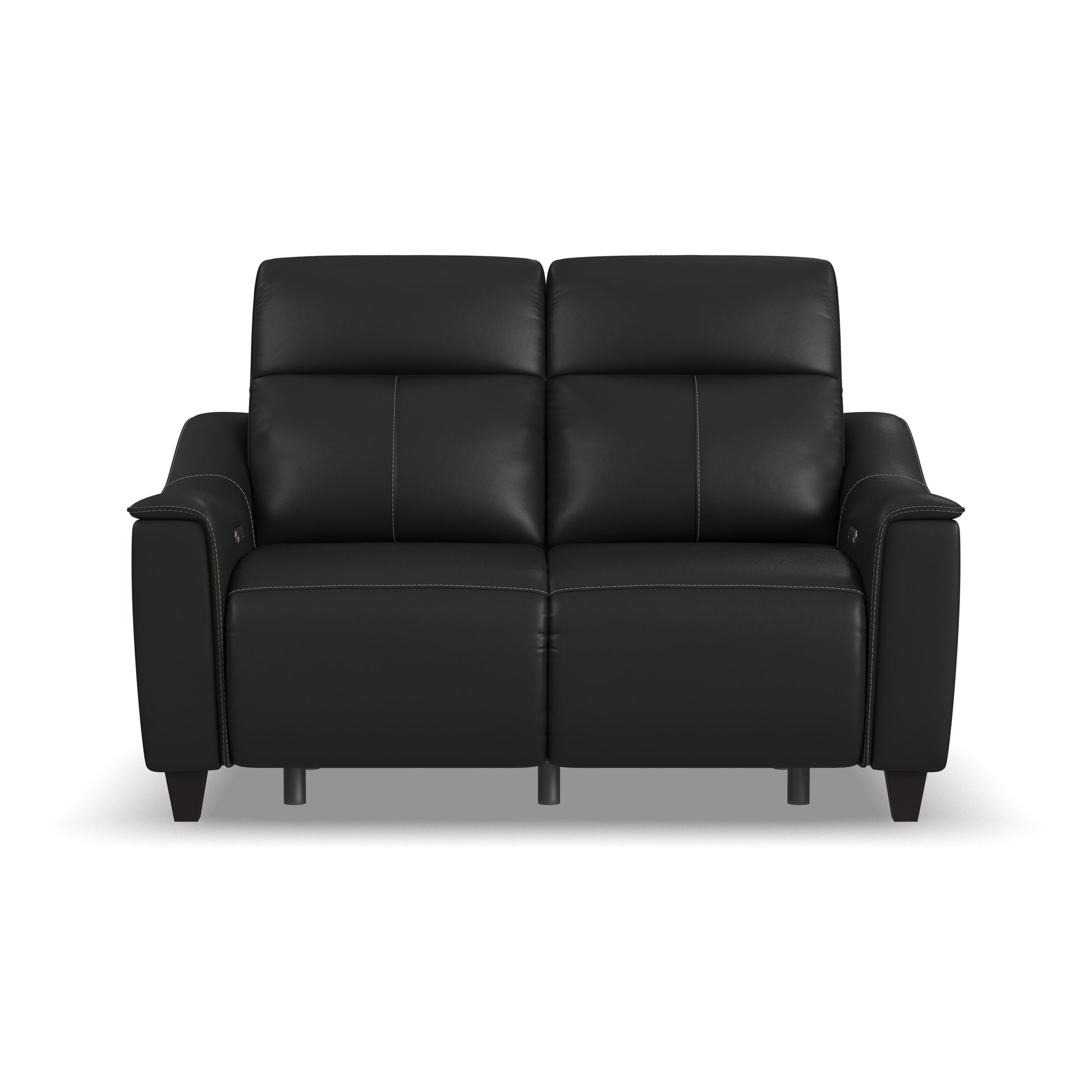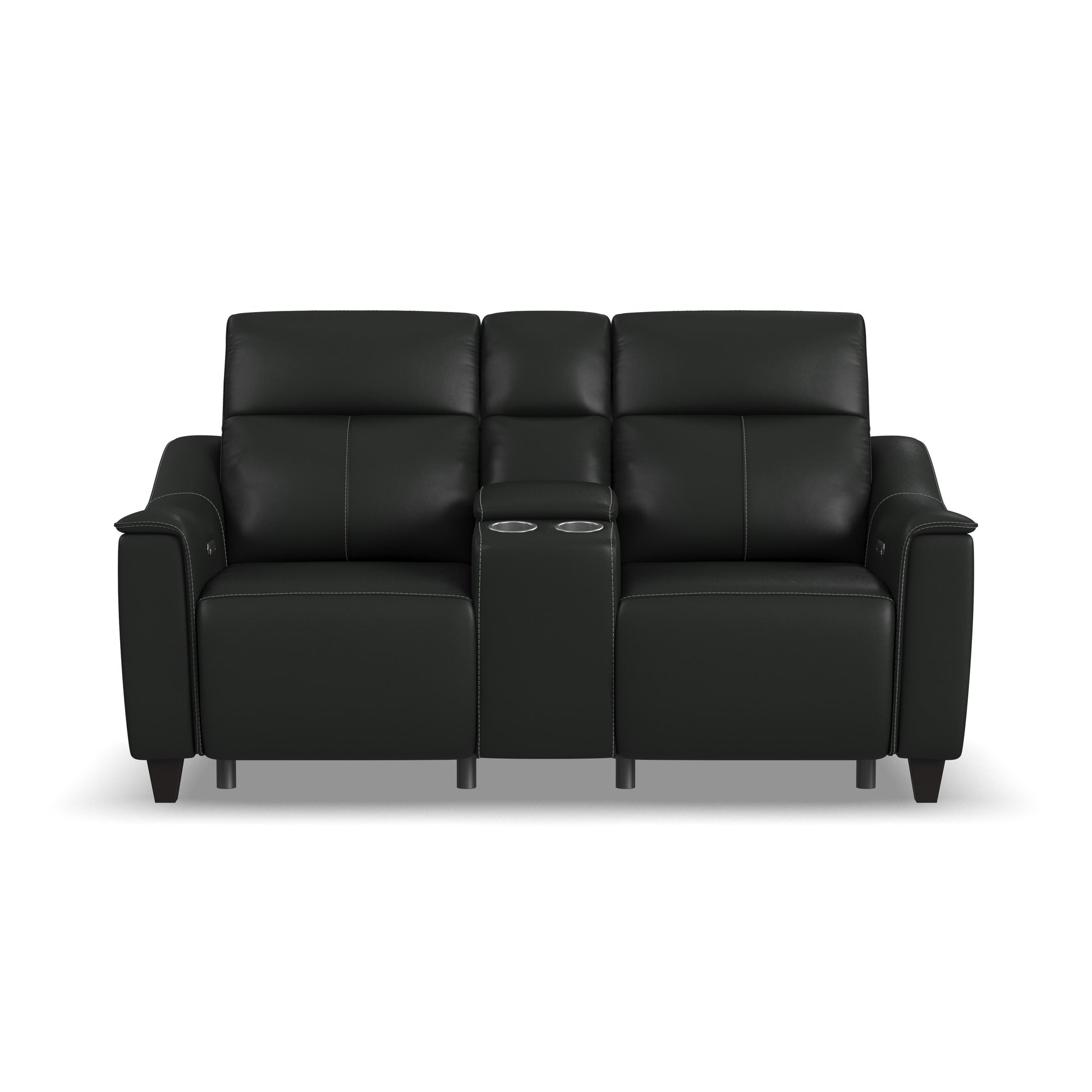 Alluring modern style merges with motion technology in the Walter leather power reclining loveseat with console. Featuring thin, pad-over sloped track arms, square tapered legs, and flat seats, Walter mirrors the look of high-end stationary furniture. Relaxation can be fine-tuned with an adjustable recline, powered headrests, and extended footrests, while high, divided backs support shoulders. Conveniently store drinks and remotes within reach and charge devices with built-in ports. Upholstered in a high-quality, coal black leather, the Walter power reclining loveseat is designed for lasting beauty.
