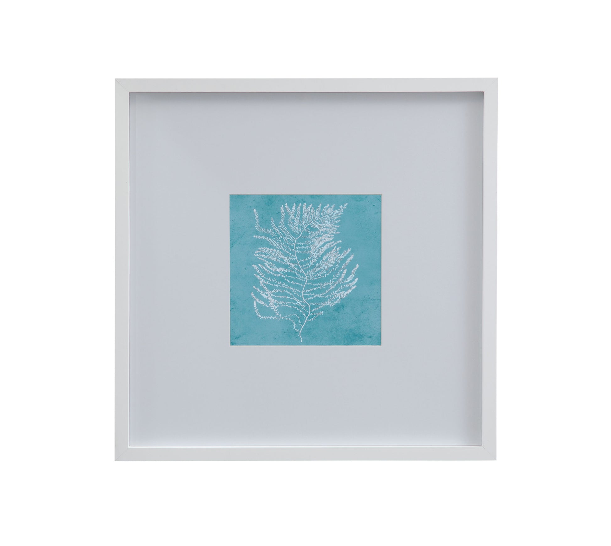 White Coral on Blue III is a print framed in a matte white 1-1/8" molding with a polar white matboard.