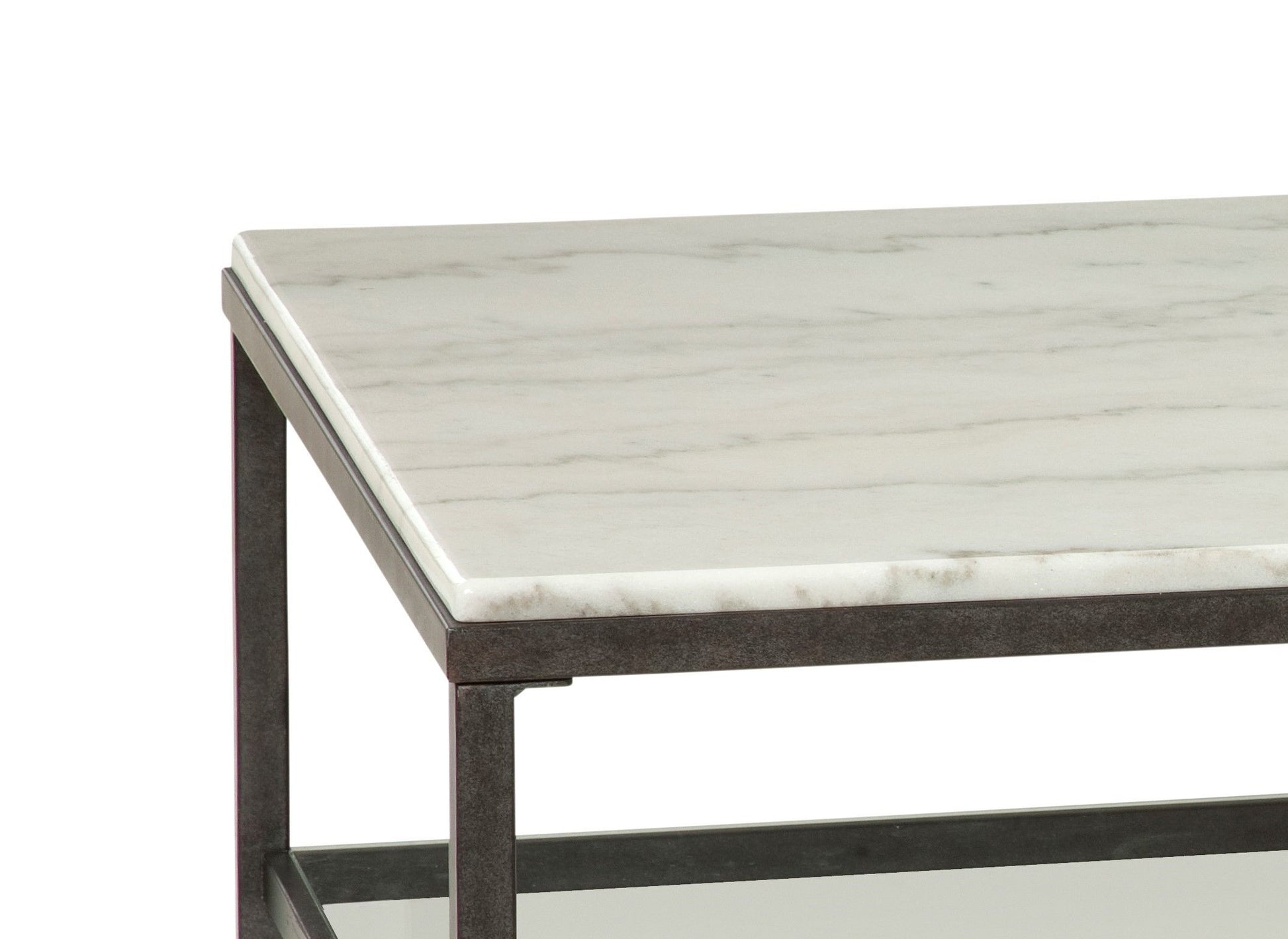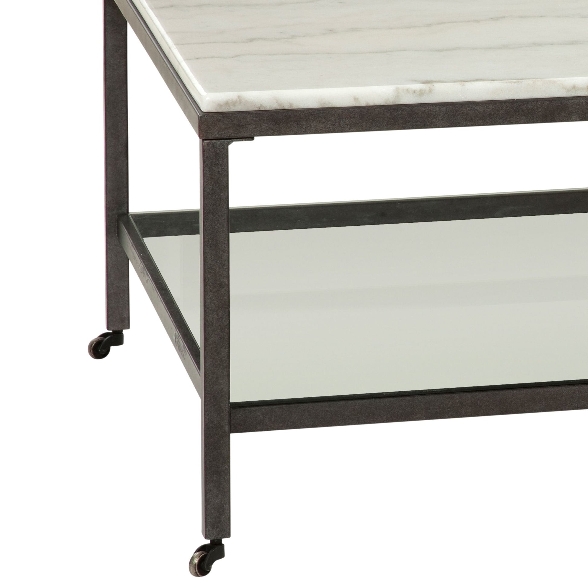 The Whitman Rectangular Cocktail Table features a striking contrast between bronze and ivory marble. The solid stone tops rests on a steel base and features piano casters for added functionality. This rectangular coffee table is accented with a clear glass shelf for extra storage.