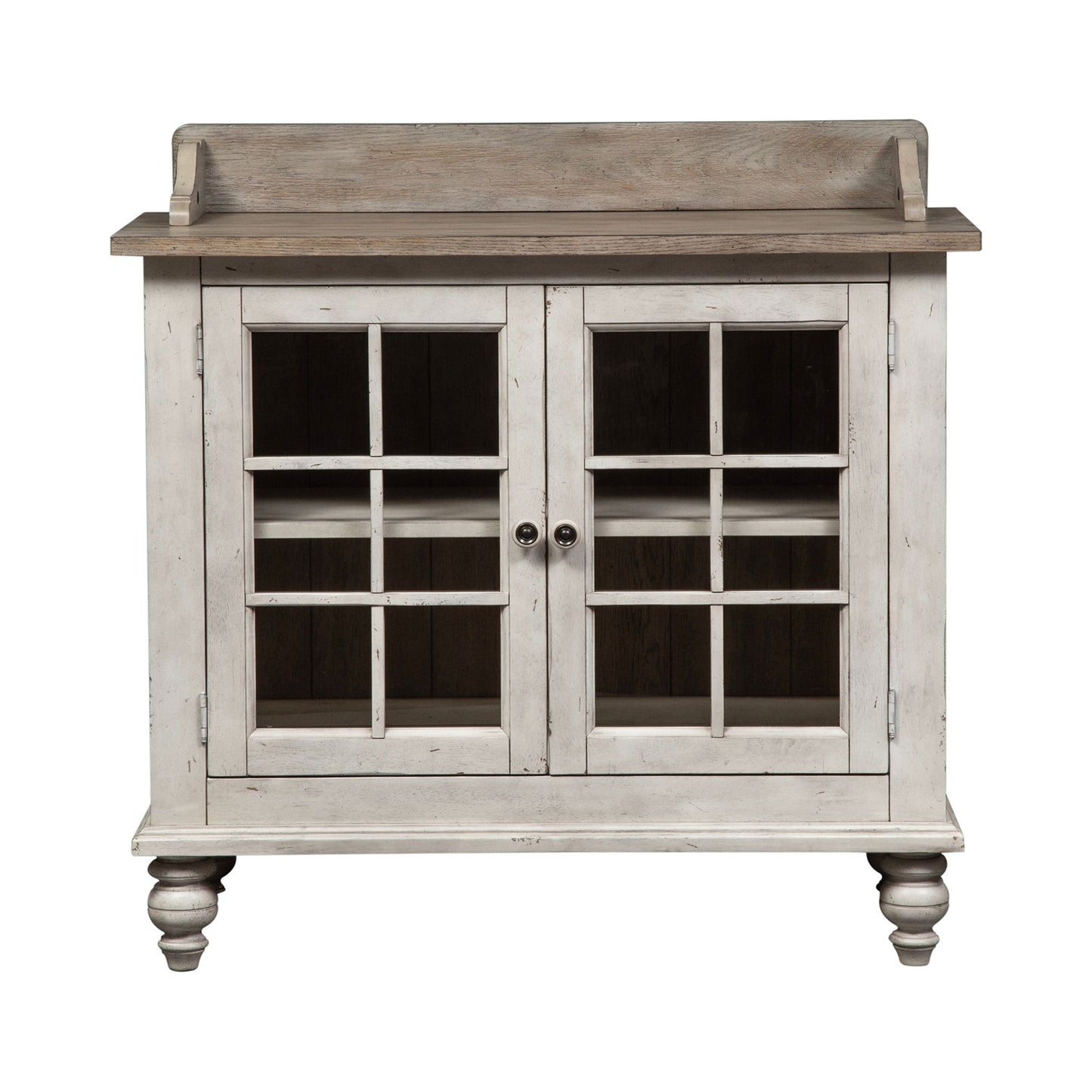 Invite an English country charm into your space with the Whitney server. Crafted of rubberwood solids and oak veneers, this piece features two wood framed glass doors with wood mullion accents, planked back panel in a weathered gray finish, a gallery top, one adjustable shelf, wood knob hardware with metal inserts, and is anchored by turned bun feet. The antique linen and weathered gray finish gives this group an heirloom appeal.