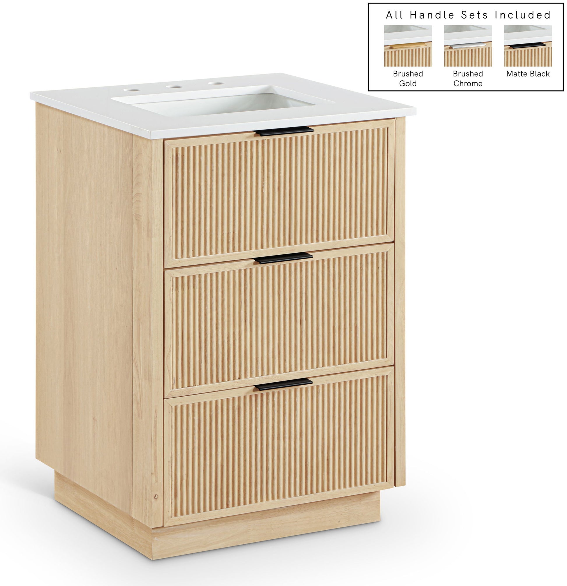 Textured wood and a sleek white engineered stone top bring contemporary style to the Willard bathroom vanity. Complete with a full set of brushed gold, chrome, and matte black handles, it's designed for a personalized finish. Spacious drawers provide ample storage, making it a stylish and functional addition to any bathroom.