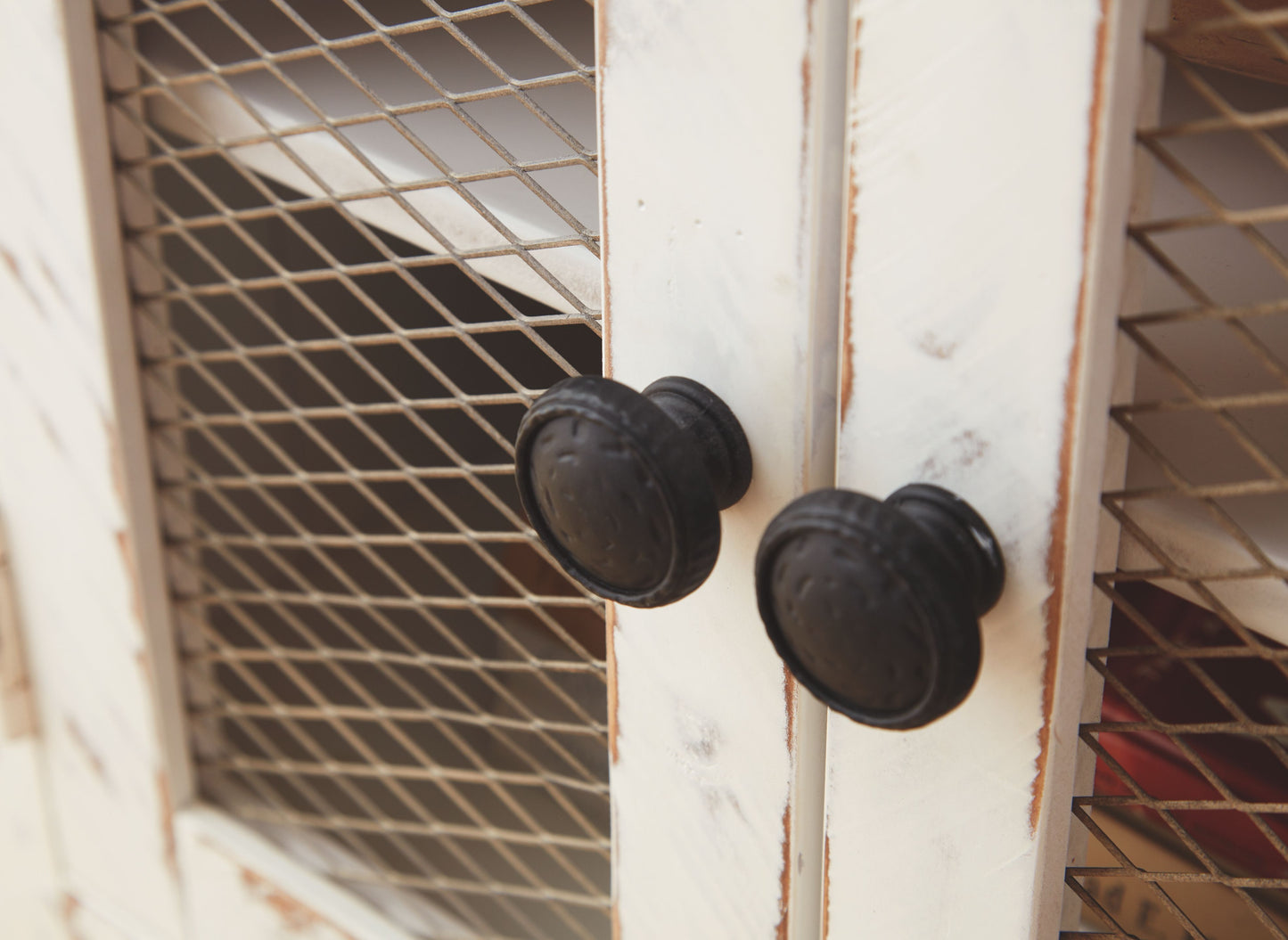 Double take. Sporting a two-tone finish that pairs a distressed vintage white with aged natural pine color, this end table elevates the art of rustic farmhouse living. Enhancing its charm: shelved storage visible through cabinet doors with inset metal grills.